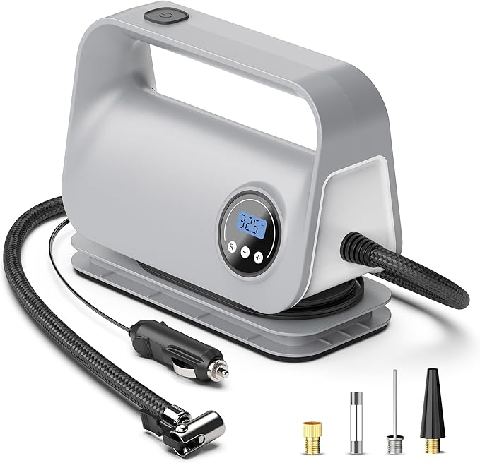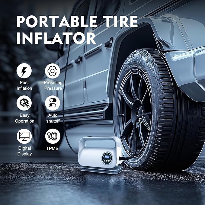 - Smart Auto-stop and LED Light: YIJU smart air pump for car tires with tire pressure gauge is built with smart detection chip for monitoring the air pressure. The tire inflator portable air compressor equipped with auto shut-off feature, the compressor stops inflating once the preset pressure is reached. It is also equipped with an LED light that stays on after being turned on to cope with the difficulty of inflating conveniently at night