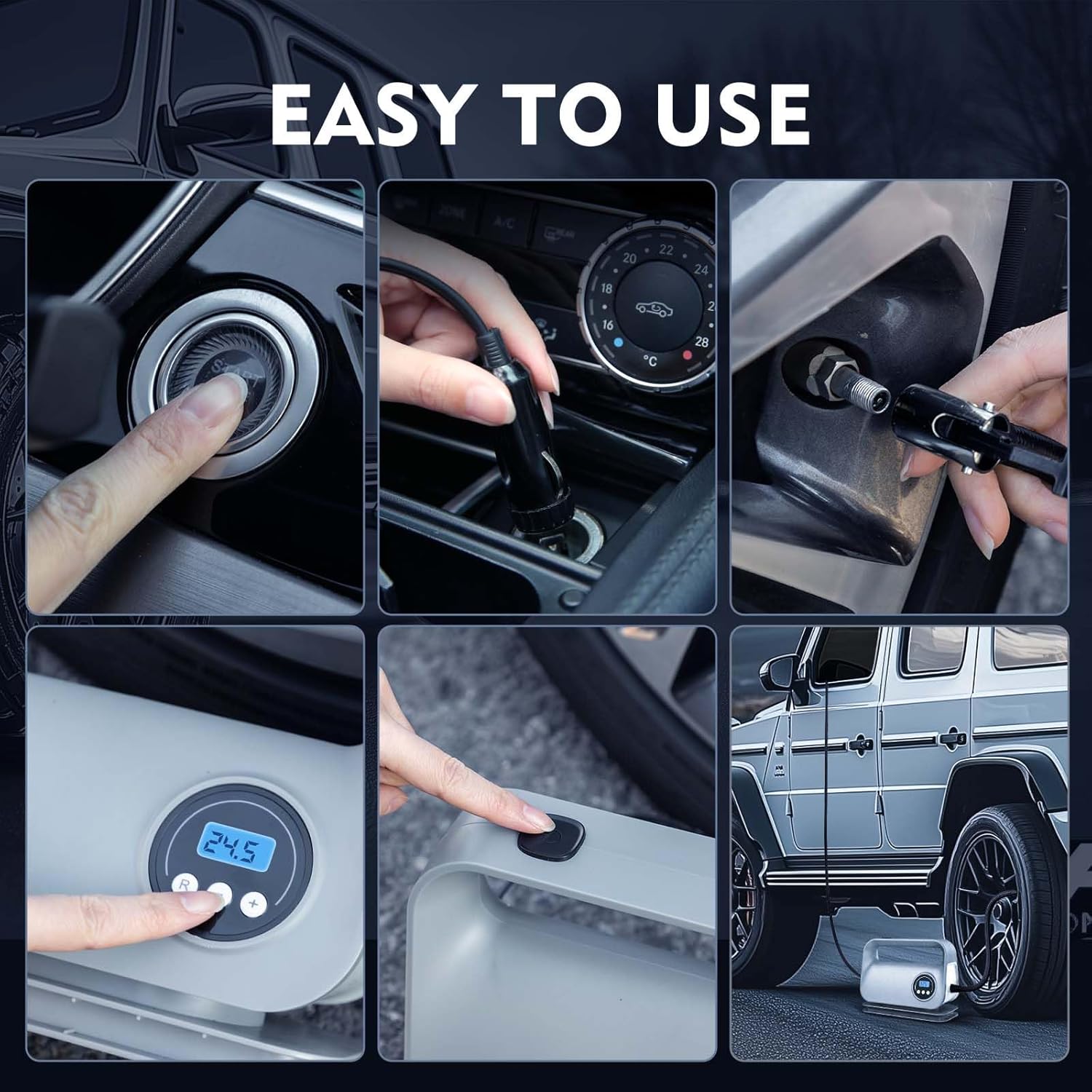 - Unique Appearance Design: YIJU portable tire pump for car adopts a trendy appearance design to distinguish the traditional design. It provides a gray color that is different from most black. Stylish and practical. It is equipped with an LED light that is always on during inflation, allowing you to inflate easily and freely in the middle of the night