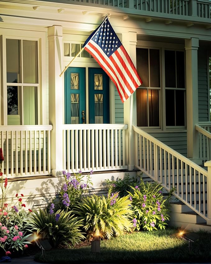 - Ultra-long Illumination Range: FabStyl solar spot lights outdoor with a high-quality circular convex lens, cast light up to 32-49 feet, which can easily illuminate the palm tree and exterior walls to surprise your neighbors or passers-by.bringing strong visual landscaping lighting. Especially illuminate your American flag with our solar flag lights to become an eye-catching centerpiece of your garden