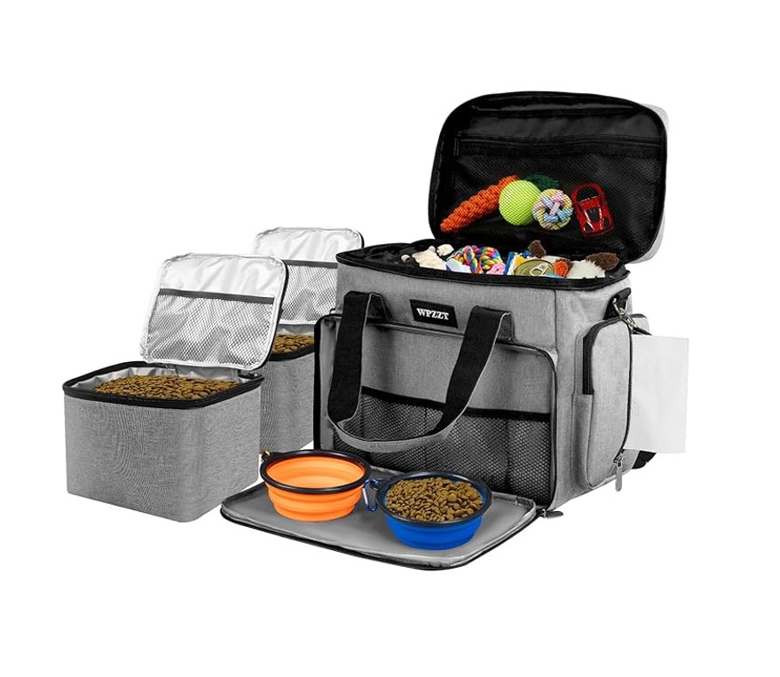 - Travel Bag For Dog Kit Include:1 x Dog Tote bag, 1x Removable Divider,2 x Dog Food carriers bag, 1x Water-Resistant Placemat, 2 x Pet Silicone Collapsible Bowls. Also comes complete with a feeding mat, ensure cleanliness during mealtime.And making it easy to keep your pet hydrated and fed on-the-go!