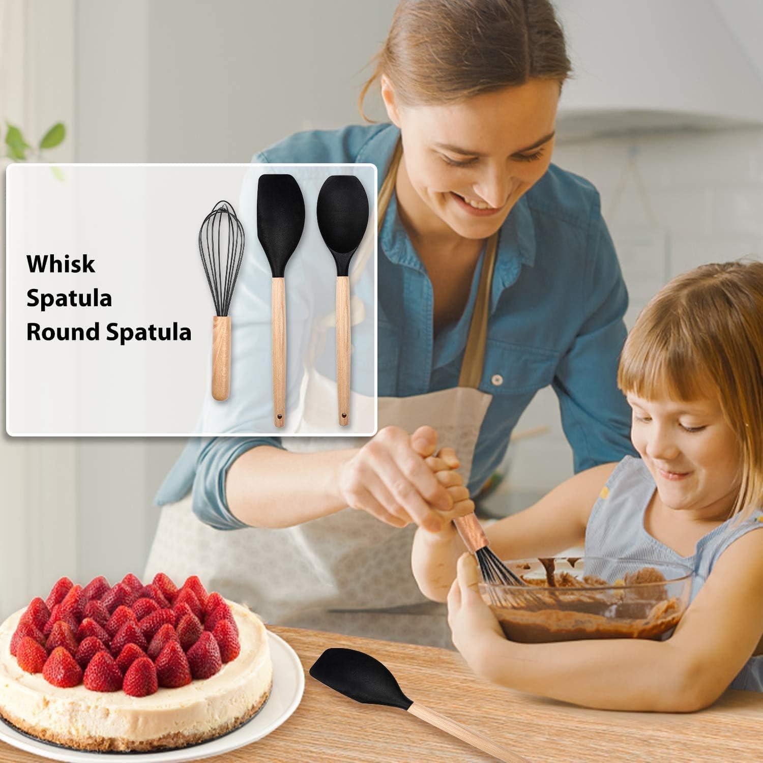 - High quality: This kitchen utensils set consists of a durable wooden handle and food-safe silicone, compared to steel set, it will not be so hot when cooking. They have a soft grip and are rustproof. No breaking, no scratches, no corrosion.