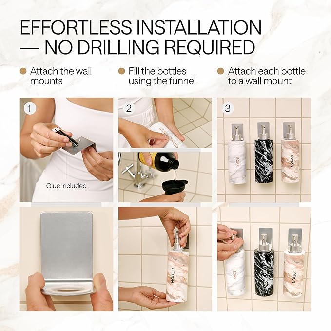 - Everything You Need in 1 Pack: our shampoo dispenser for shower package contains all you need for fast installation & use; 3 bottles & pump heads, 3 wall mounts, 3 adhesive strips, 3 mounting materials, 18 labels, 1 funnel & 1 extra pump