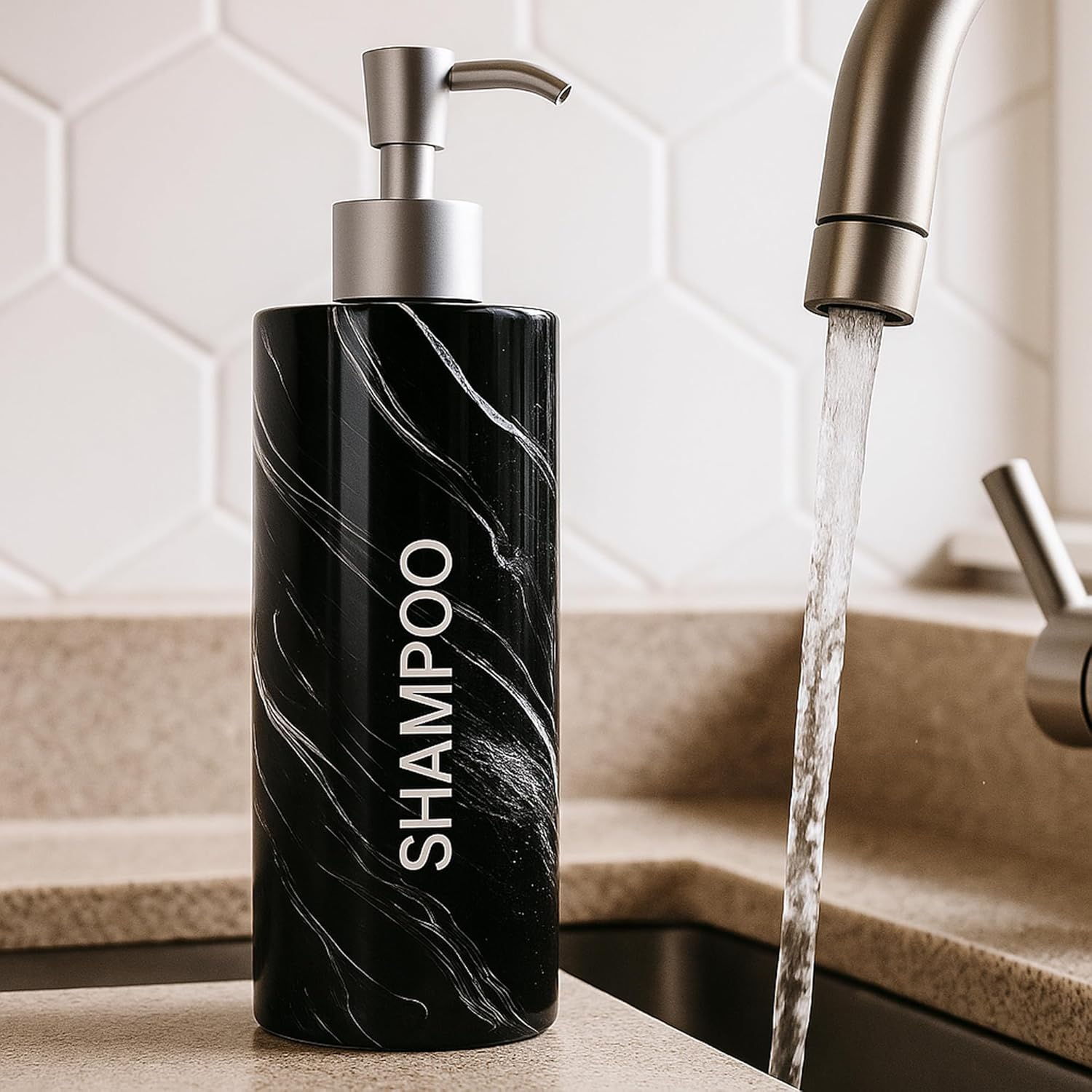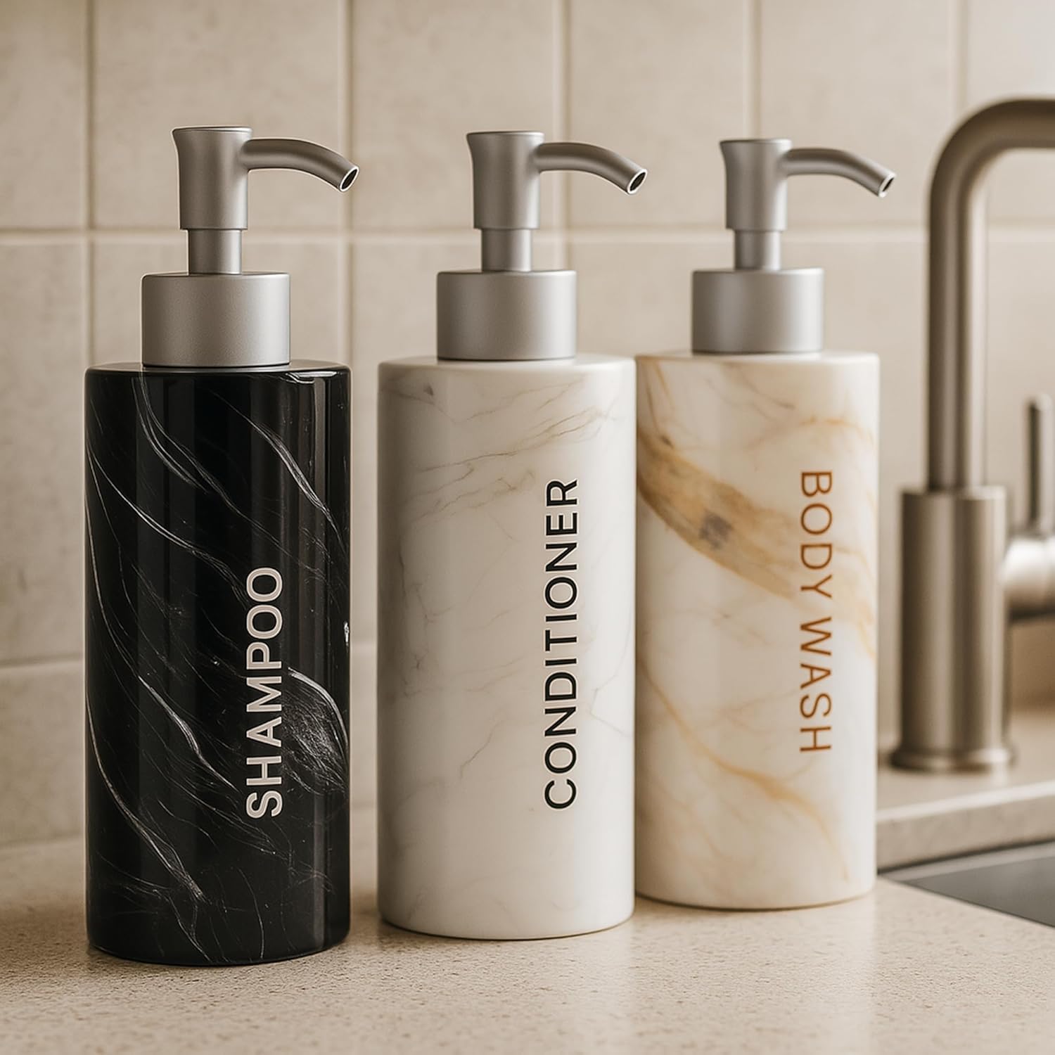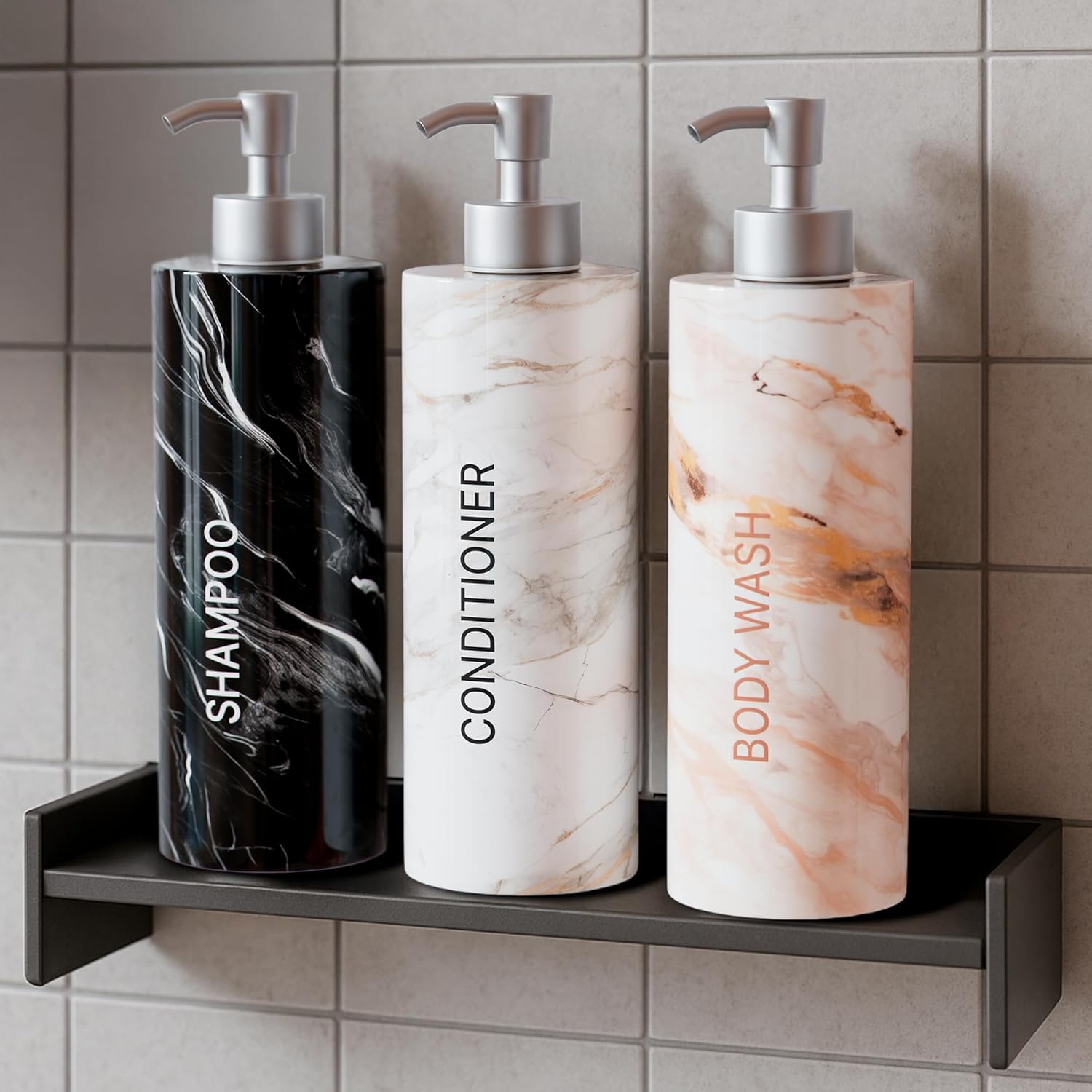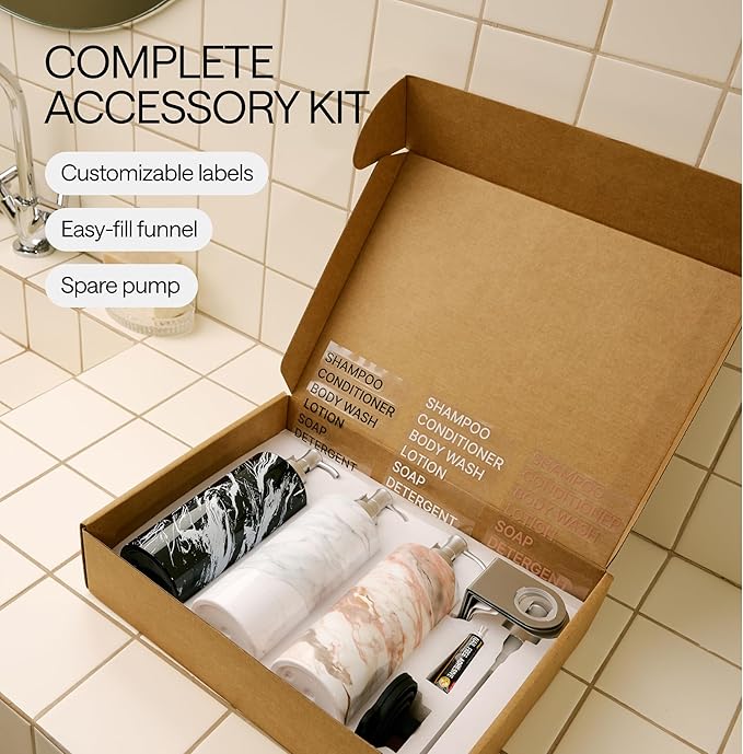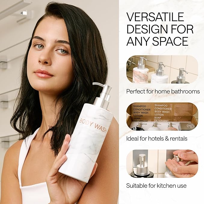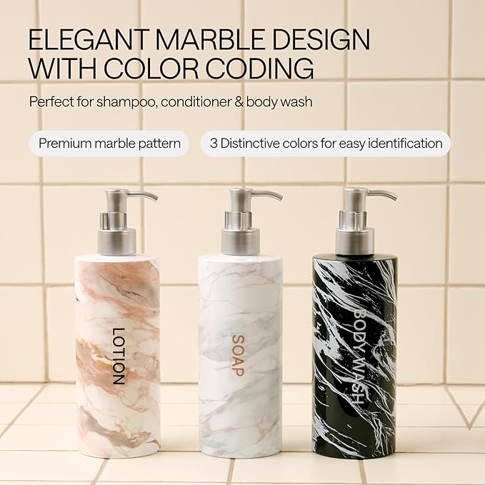 - Stylish Bathroom Soap Dispenser Set: featuring a unique marble print, our shower pump bottles for shampoo and conditioner can complement any bathroom interior while the premium non-toxic plastic ensures safe use of our shampoo pump dispenser