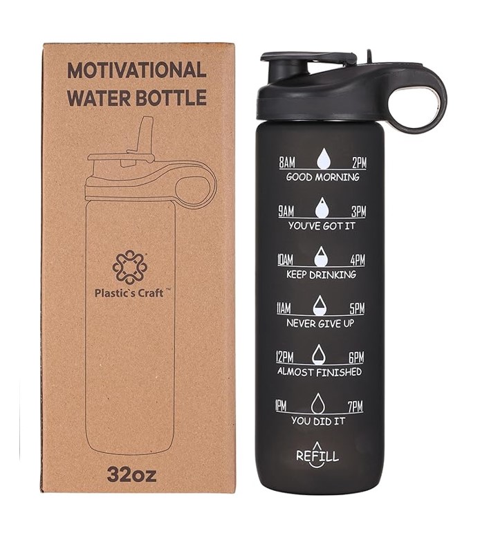 - Motivational Hydration: This big water bottle with straw has a 12-hour marker on the side to help you track how much water you drink each day and to encourage you to drink more. The clearly marked time indicators on this motivational travel water bottle assist you in pacing and maintaining your hydration goals.