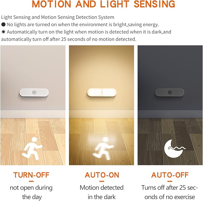 - Closet Lights Motion Sensor: The closet lights battery operated supports motion activated sensor and light sensor, Sensor lights indoor only turns on when it’s dark enough and has motion detected, auto-off after about 25 seconds of no motion detected., motion detecting distance within 10ft, detecting angle is 120 degree.