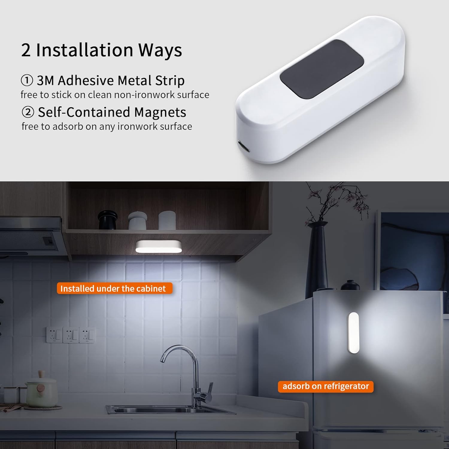 - Night Light Motion Sensor: Motion lights for closets cabinet light, its material is ABS plastic, Small and can be sticked-anywhere! Led motion sensor cabinet light can be attached to smooth surfaces with an adhesive-backed iron sheet. The adhesive is very strong, and the light does not come off easily. battery lights for closet have a magnet on the back, which can also be directly attached to the iron plate. Stick on motion light should be placed away from heat sources.