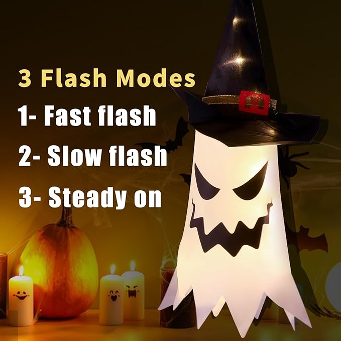 - Package Contains: The Halloween decorations include 4 PCS hanging lighted glowing ghost witch hat. it is a awesome idea to hanging them as Halloween decor on the yard, terrace, eaves, garden and trees. At night, they seem to float in the air and greet you by flashing lights, creating a mysterious atmosphere