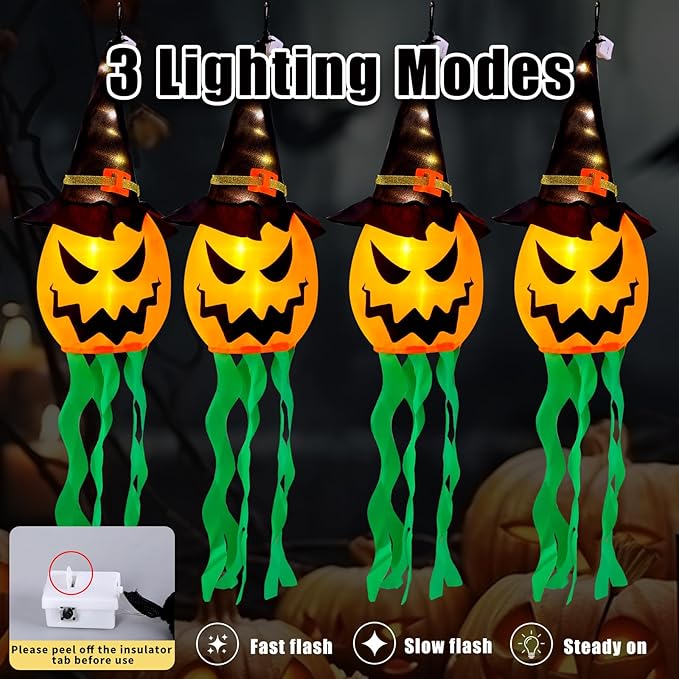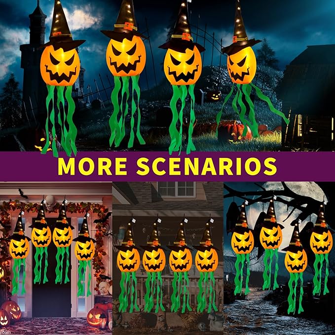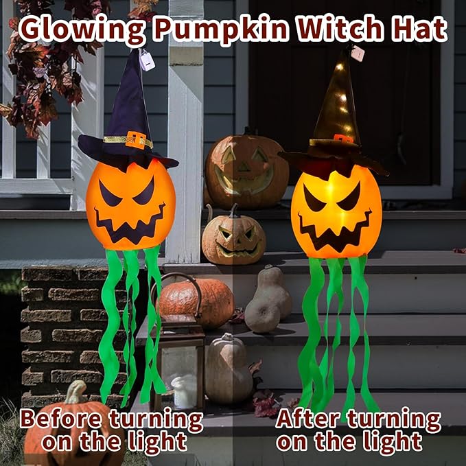 • Package Contains: The Halloween decorations include 4 PCS hanging lighted glowing pumpkin witch hat. it is an awesome idea to hang them as Halloween decor on the yard, terrace, eaves, garden, and trees. At night, they seem to float in the air and greet you with flashing lights, creating a mysterious atmosphere.