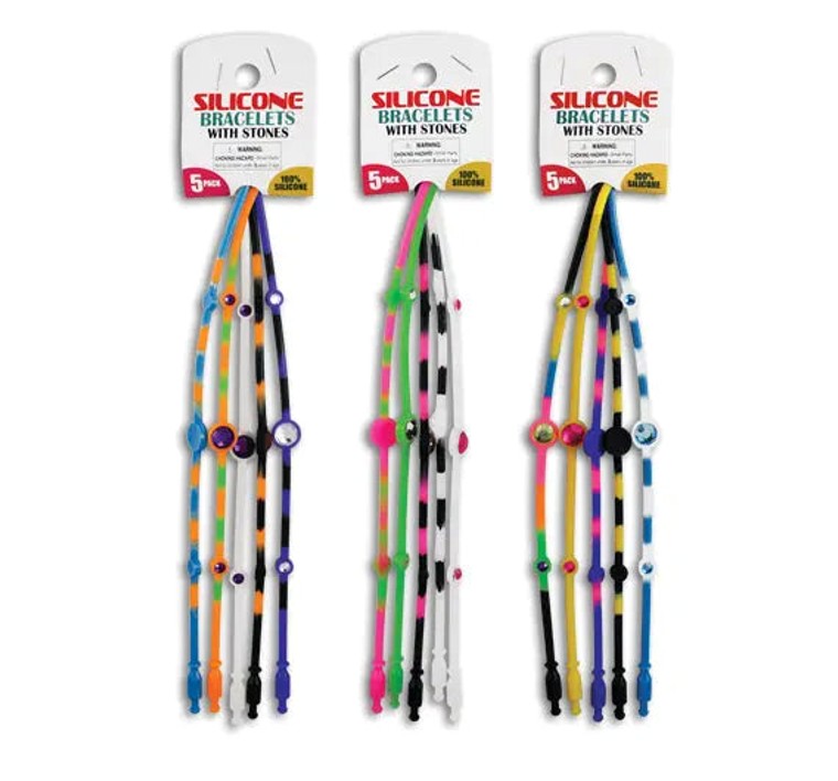 Bring style, color, and personality to your accessories with our Silicone Bracelet 5-Pack! Each set includes five soft, flexible silicone bracelets designed with vibrant colors and decorative stone accents. These lightweight bands are comfortable enough for all-day wear and durable enough for everyday play.