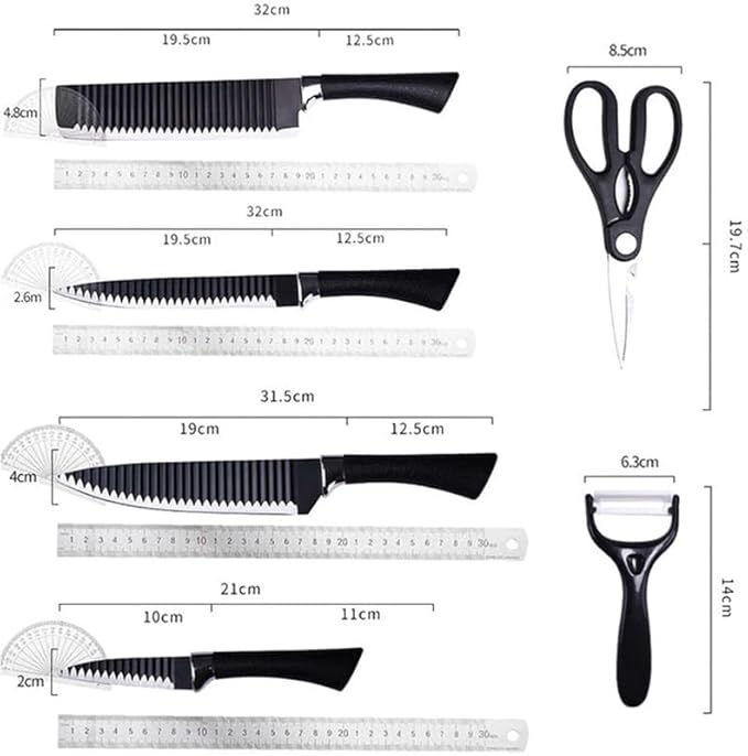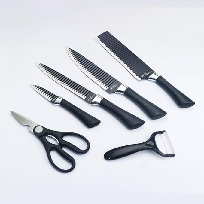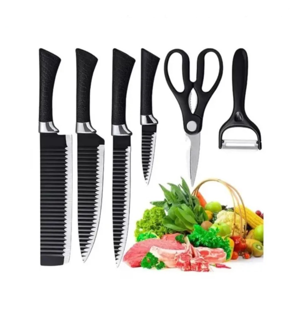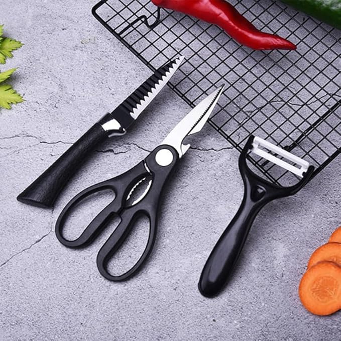 1. This kitchen knife set consists of a kitchen knife, meat, fruit, bread, fruit peel and kitchen scissors.