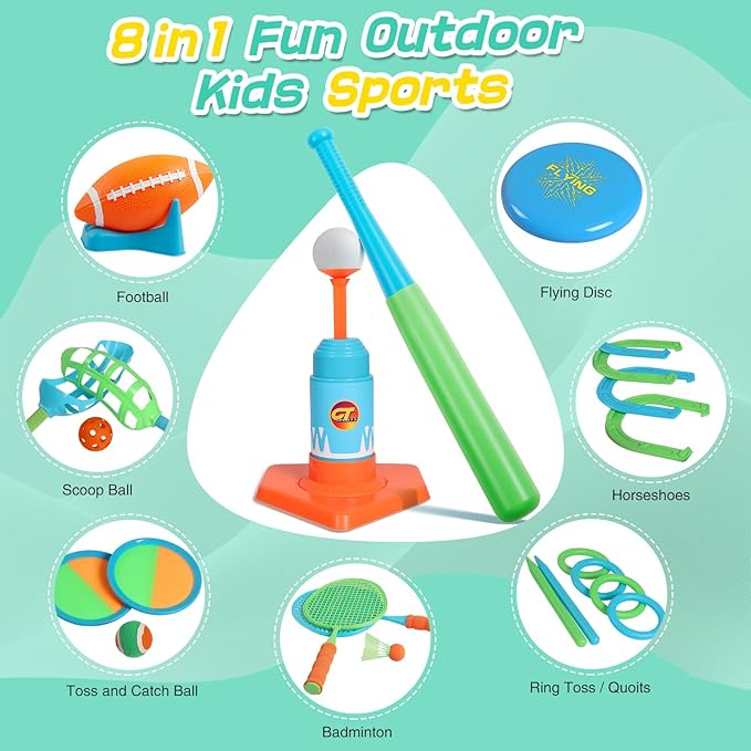 - 8-in-1 Outdoor Game Set:Includes spoon race, horseshoes, ring toss, football toss, flying disc, catch ball, baseball, badminton, and a storage bag. A complete outdoor sports kit that keeps kids engaged for hours in the backyard, park, or camping site.