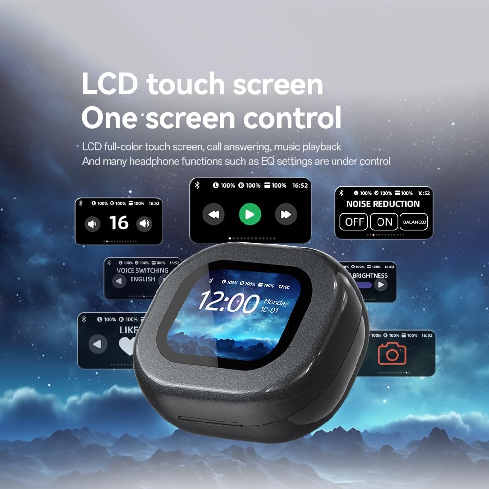 - Multifunctional Smart Touch Screen: These touch screen earbuds come with a color touch display. You can use the ear buds or charging case to control music playback, switch tracks, answer and end calls, and more. In addition, the touch screen also provides a series of functions such as volume adjustment, camera control, seven language switching, wallpaper switching, screen brightness adjustment, headphone search, timer, etc.