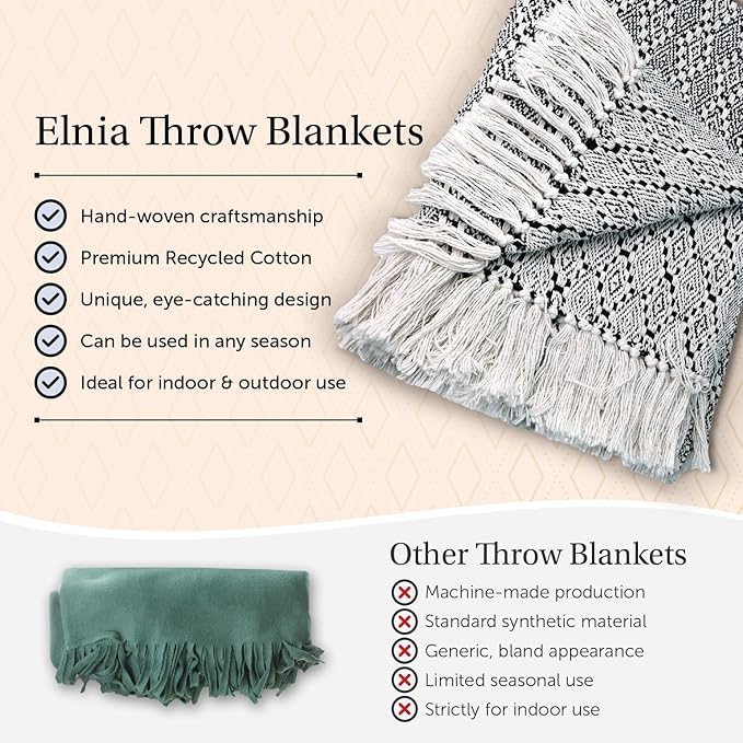 - Sustainable Comfort Indulge in the comfort and eco-friendly benefits of luxuriously soft cotton. Woven with a breathable design, this throw blanket allows for natural airflow, making it perfect for use in all seasons. Its sustainable materials help you make a good choice for the planet without sacrificing comfort.