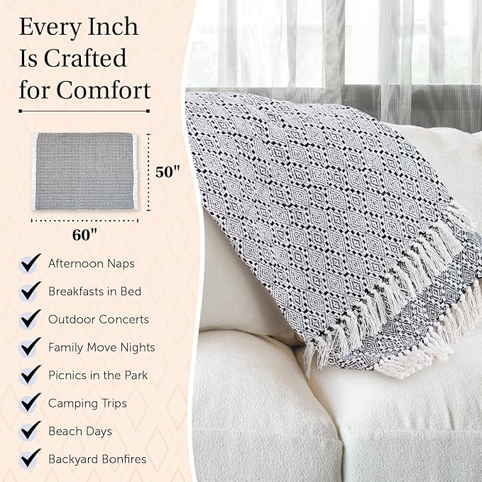 - Year-Round Coziness Crafted from lightweight, natural cotton, All Season Throw Blankets for Couch offers a year-round cozy vibe. Curl up with a book on the couch, take it on outdoor escapades to snuggle by the campfire, seek warmth indoors or a touch of comfort during a summer picnic, this throw adapts to your needs.