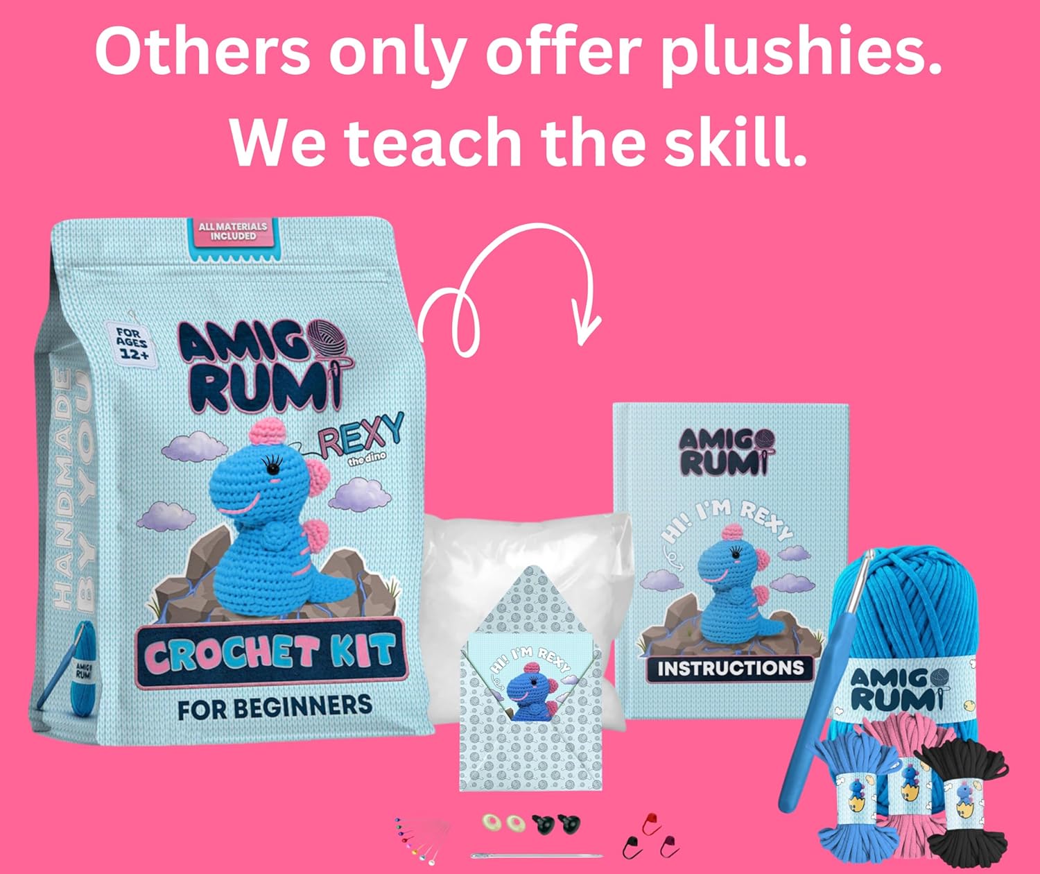 - START A NEW HOBBY – Rexy is part of our series of DIY crochet kits dedicated to women, men & teens who got bored of their phones and are looking for a cute animal crocheting kit to maneuver through the basic skills necessary to create amigurumi crafts and advance to an intermediate level. Crocheting time is 3 to 8 hours in total depending on your level.