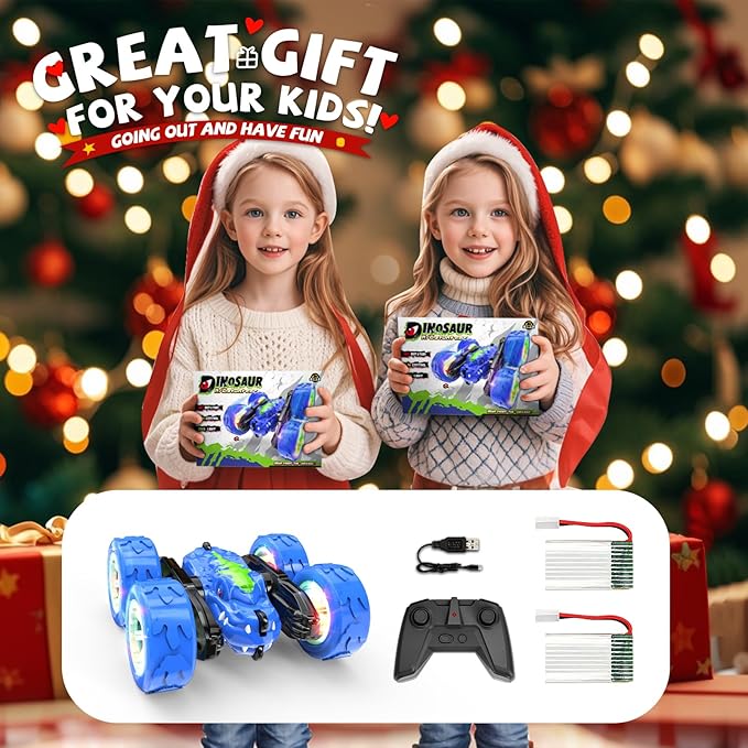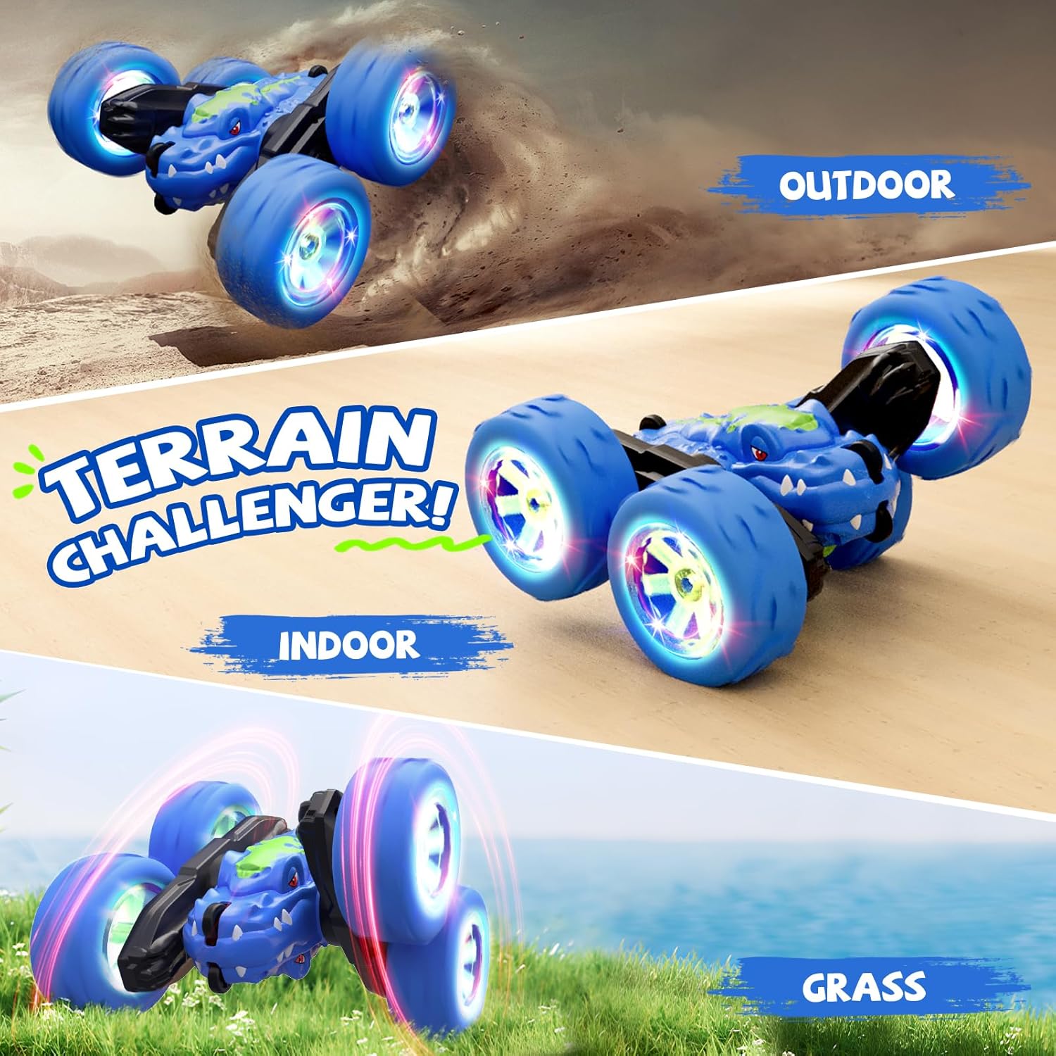 - Unique Cool Shape – Our dinosaur remote control car adopts a vivid shape design with rich color combination and built-in color Led lights, which makes our remote-control car look very novel and unique! In addition, coupled with the 360 ° flip and double-sided driving stunt, easy operation toys for Ages 5-7 8-13