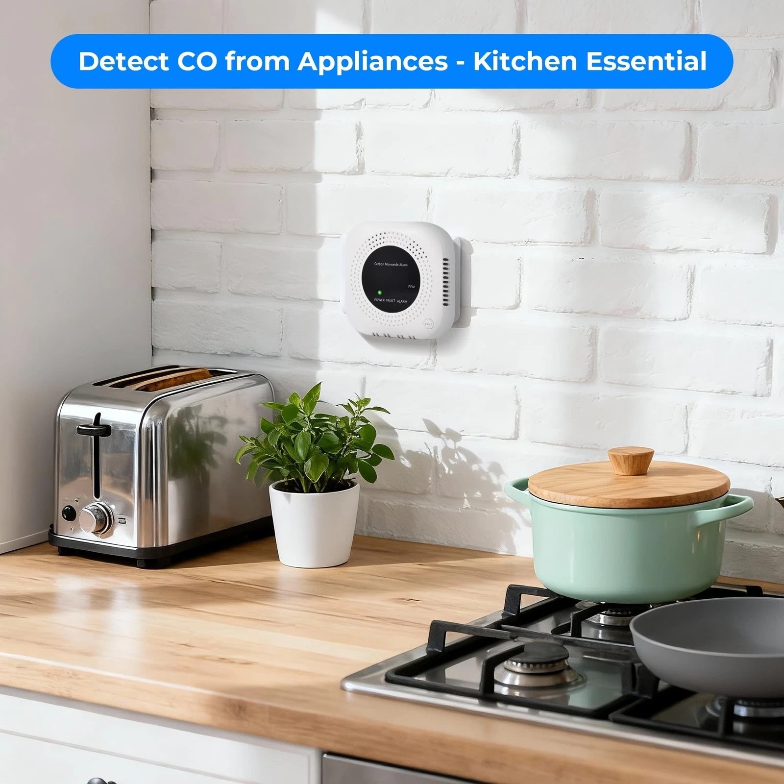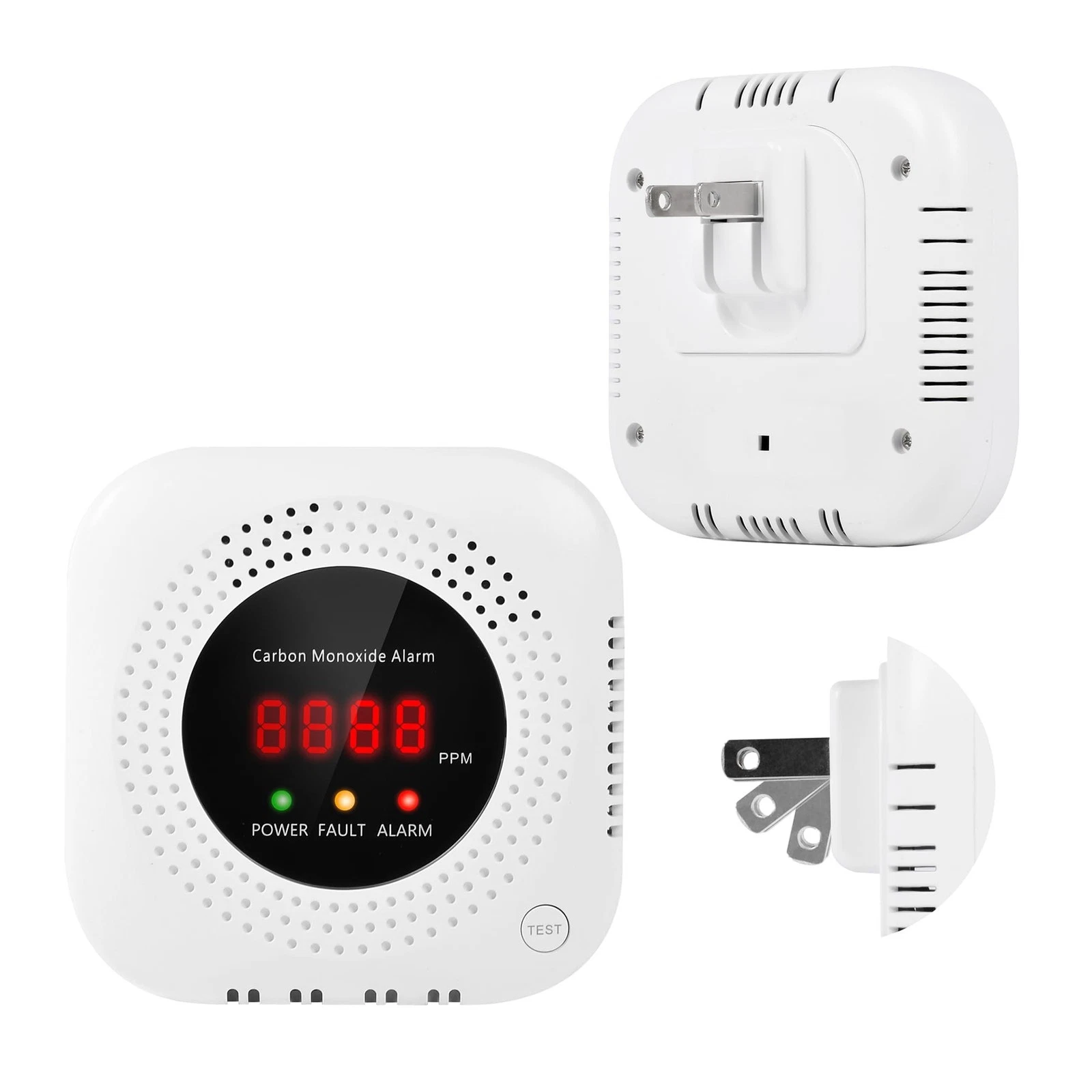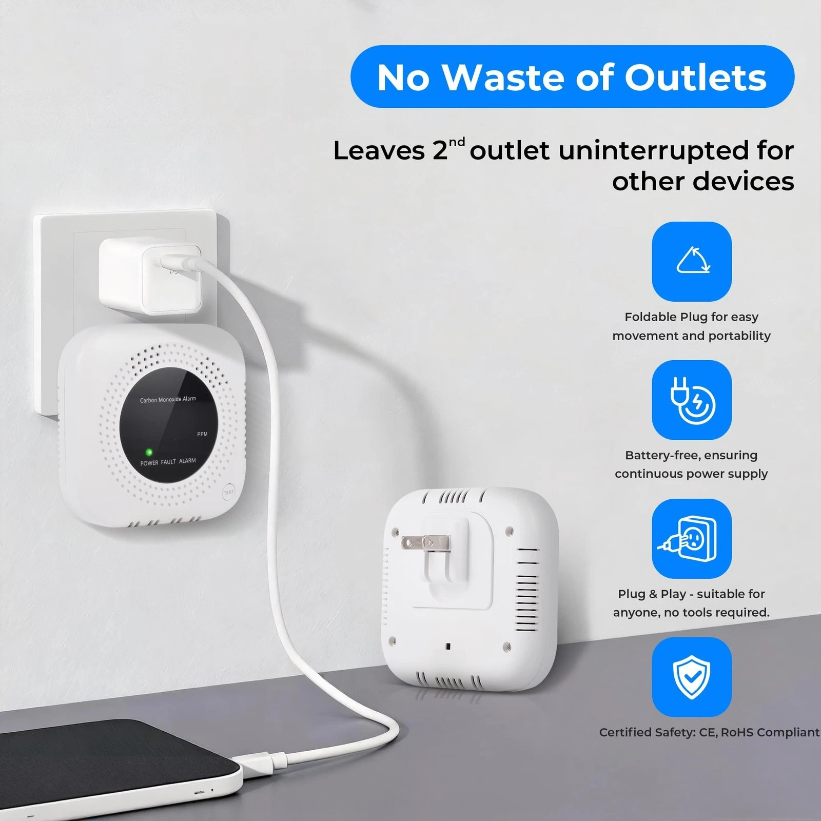 - Plug-in Carbon Monoxide Alarm with No Battery Needed: This plug-in carbon monoxide detector is powered by 110-230V outlet, with foldable plug that does not block other sockets. Ideal for home, kitchen, garage, camper and travel.