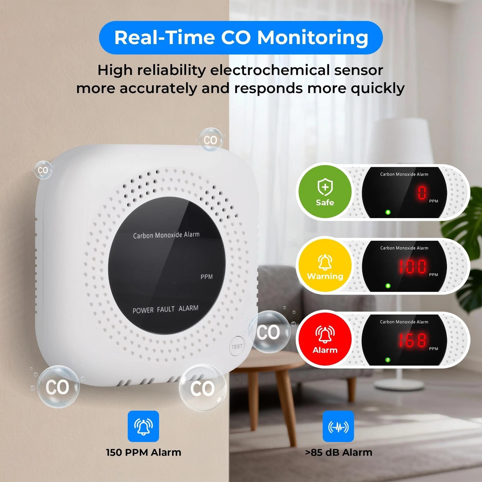 - Digital Display & 85dB Loud Alarm: Clear led digital display shows real-time status when carbon monoxide concentration exceeds the standard. Even while sleeping, an 85dB sound alarm and flashing red light are enough to wake you up.