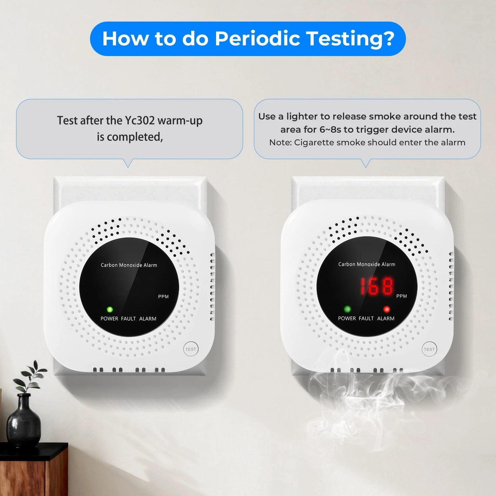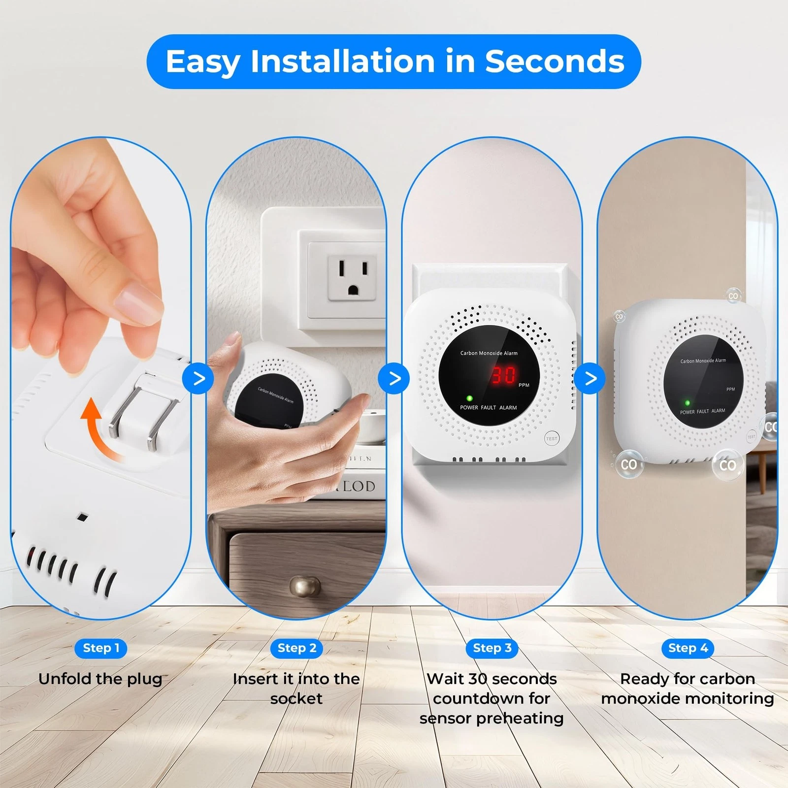 - Gentle Reminder: Before first use, please peel off the plastic film. Plug in the detector and wait 30 seconds countdown for sensor preheating. then press the test button and if the alarm is triggered, you can use it with confidence after confirming that it works normally.