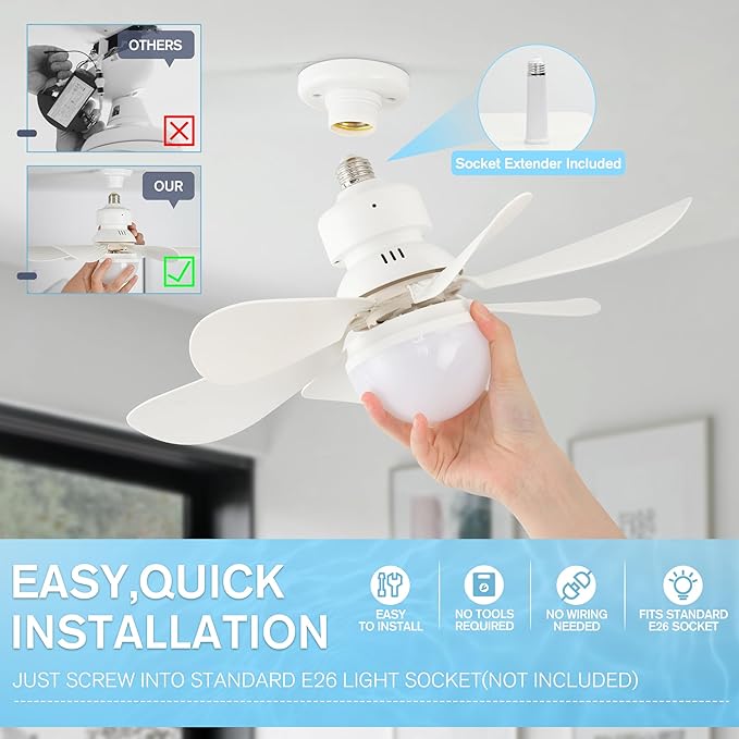 • Easy Wireless Installation: Compared to traditional ceiling fan lights, installing our cordless fan light is as simple as changing a light bulb, and completely wireless. No tools or electricians required. Compatible with most E26 socket bases (not included), it comes with a 4.7 inches socket extender to solve deep socket issues, ensuring optimal ventilation. Remote control requires 2 AAA batteries (not included).