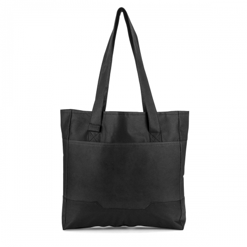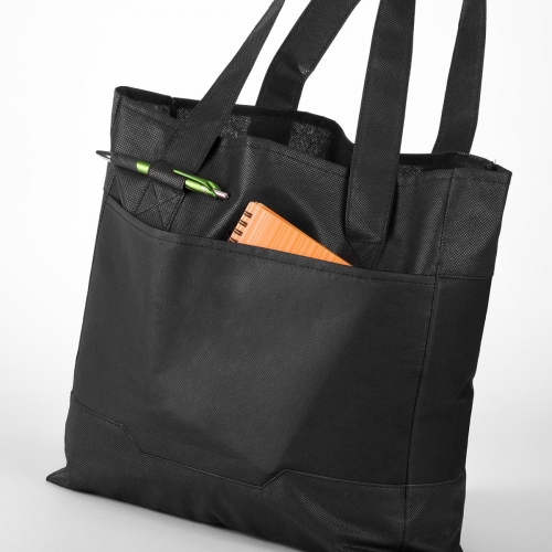 Sturdy 80GSM polypropylene nonwoven tote with bold color pane. Double shoulder strap for comfort; convenient pen loop; and open front pocket.