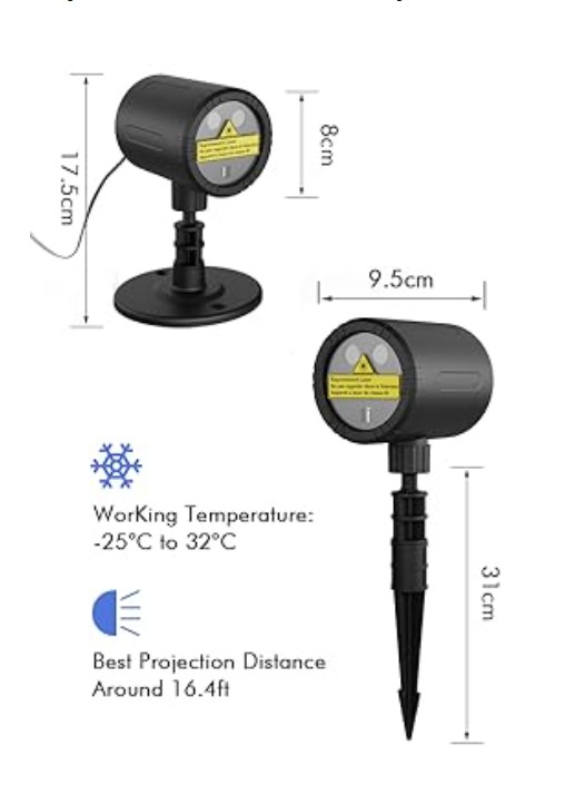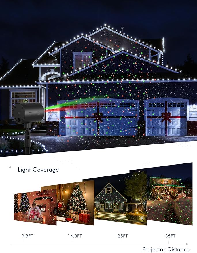 - Red and green light: Waterproof Projector Lights can be projected onto walls, lawns, floors, gardens, and trees, with a range of up to 3,900 sq. ft. from a distance of 25 ft. Three light modes can be set: red mode, green mode, and red-green mode