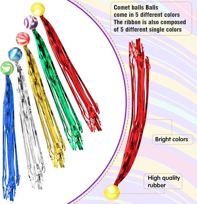 - Suitable Size and Reliable Material: the ribbon is about 9.84 inches/ 25 cm in length, the bouncy ball is about 1 inches/ 2.5 cm in diameter, suitable size for various uses; The comet bouncy ball is made of quality rubber material, which is reliable and sturdy