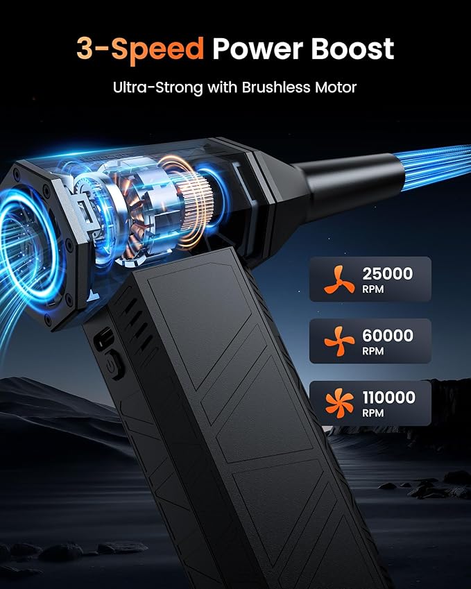 - Adjustable Airflow Control: With 3-speed adjustable settings, this cordless blower allows you to customize the airflow according to your cleaning needs. Whether you’re using it as a compressed air duster for delicate items or tackling tougher messes, it provides versatile performance.