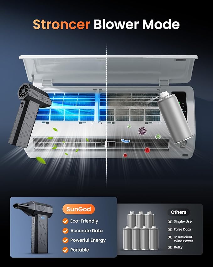 - Mini but Super Power: Sungod newest mini compressed air duster features a powerful motor that delivers exceptional blowing force, making it the ideal electric air duster for efficiently removing dust and debris from keyboards, cars, and home electronics.