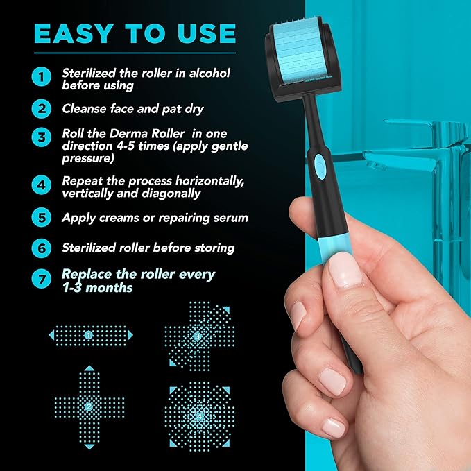 • Age Gracefully – A Microneedle derma roller can be used on every part of your face or body that needs an extra boost of vitality. Adding a dermal roller to a consistent skin care routine will up your game to the next level. Any skin type can benefit from a micro roller. An exfoliating roller can help you fight age and age gracefully. It just takes a few minutes per day. Only light pressure is needed to give your skin what you need. Your choice!