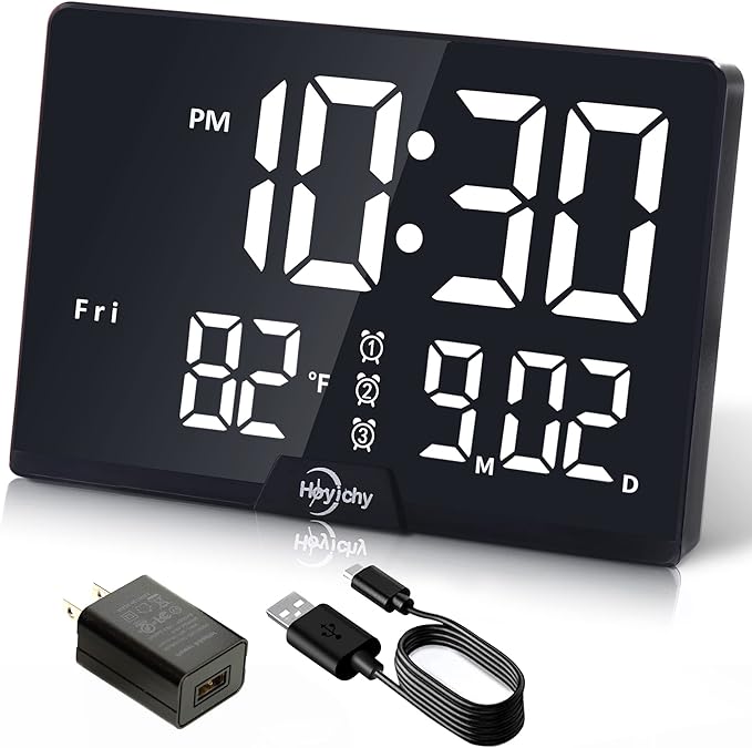 - 𝗦𝗼𝘂𝗻𝗱 𝗖𝗼𝗻𝘁𝗿𝗼𝗹 & 𝗧𝗼𝘂𝗰𝗵 𝗖𝗼𝗻𝘁𝗿𝗼𝗹 𝘁𝗼 𝗟𝗶𝗴𝗵𝘁 𝘂𝗽 𝟲.𝟱’’ 𝗟𝗮𝗿𝗴𝗲 𝗖𝗹𝗲𝗮𝗿 𝗗𝗶𝘀𝗽𝗹𝗮𝘆 & 𝟰-𝗟𝗲𝘃𝗲𝗹 𝗗𝗶𝗺𝗺𝗲𝗿: With big LED display (5.31” 3.54” 1.38”), the distinct readouts on the calendar clock are ultra-clear to see from a long distance or across the room even without glasses. 4 level adjustable screen brightness help you avoid high-intensity light while you are asleep or easily view the time in the daytime. When the screen is turned off, just clap hand or knock the table to light up the screen by sound control, no need to turn on light to check the time at night. Also press any button to light up the display.