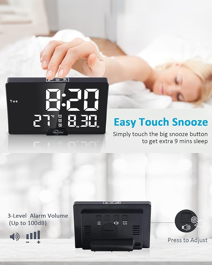 - 𝟯-𝗟𝗲𝘃𝗲𝗹 𝗔𝗱𝗷𝘂𝘀𝘁𝗮𝗯𝗹𝗲 𝗔𝗹𝗮𝗿𝗺 𝗩𝗼𝗹𝘂𝗺𝗲 & 𝗘𝗮𝘀𝘆 𝗧𝗼𝘂𝗰𝗵 𝗦𝗻𝗼𝗼𝘇𝗲: The digital alarm clock for bedroom is boasting 3 level adjustable alarm volume with max volume 100db. Needless to worry the alarm sound is either too loud thus frightening you or too low to wake you up from deep sleeping. Just repeat press “+” button to adjust alarm volume as your needs, and max volume 100db definitely wake you up refreshed, a useful loud alarm clock for heavy sleepers. The snooze button at top of the bedside alarm clock, simply touch the button without getting your eyes open when sleepy to get extra 9 minutes sleep.