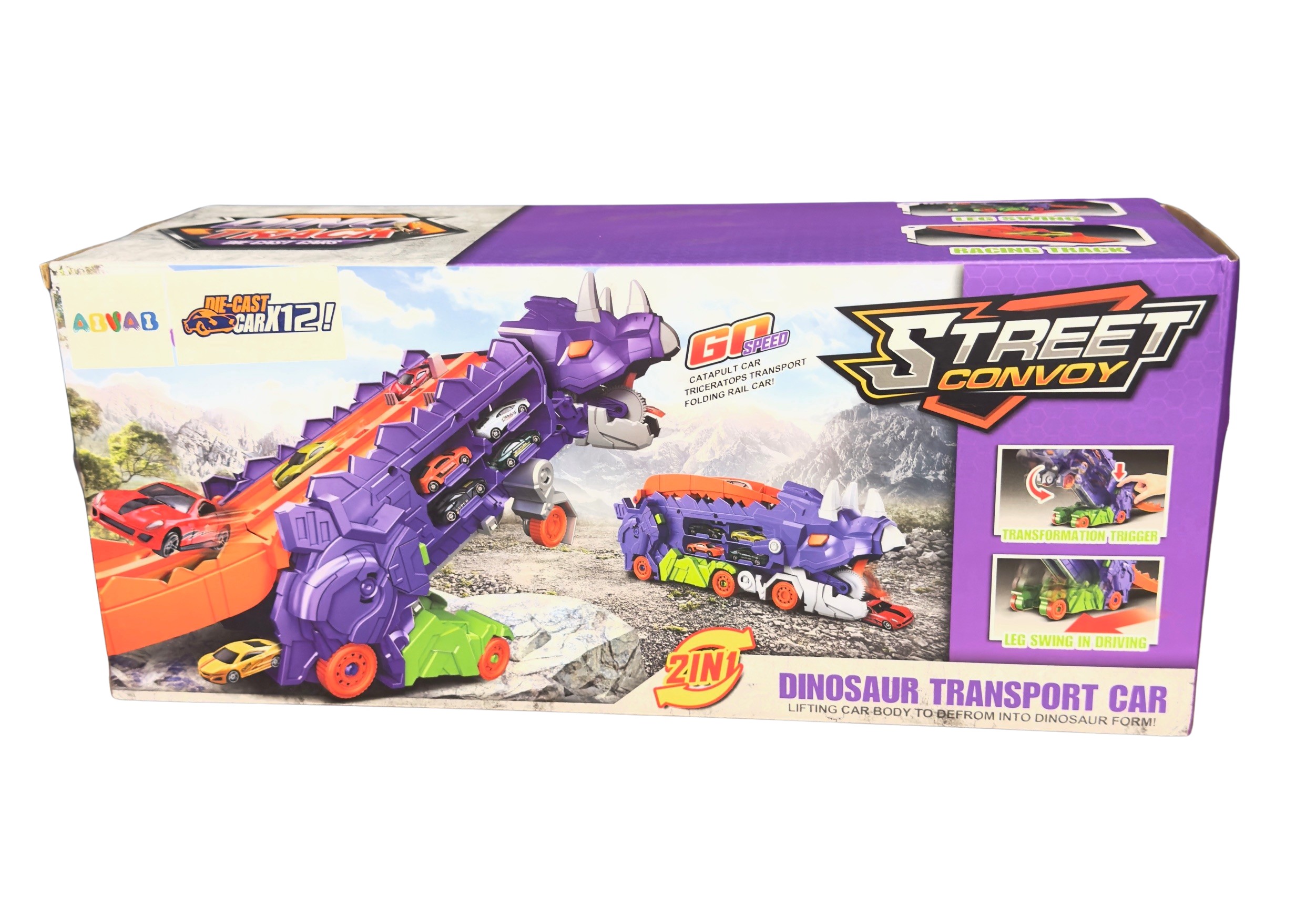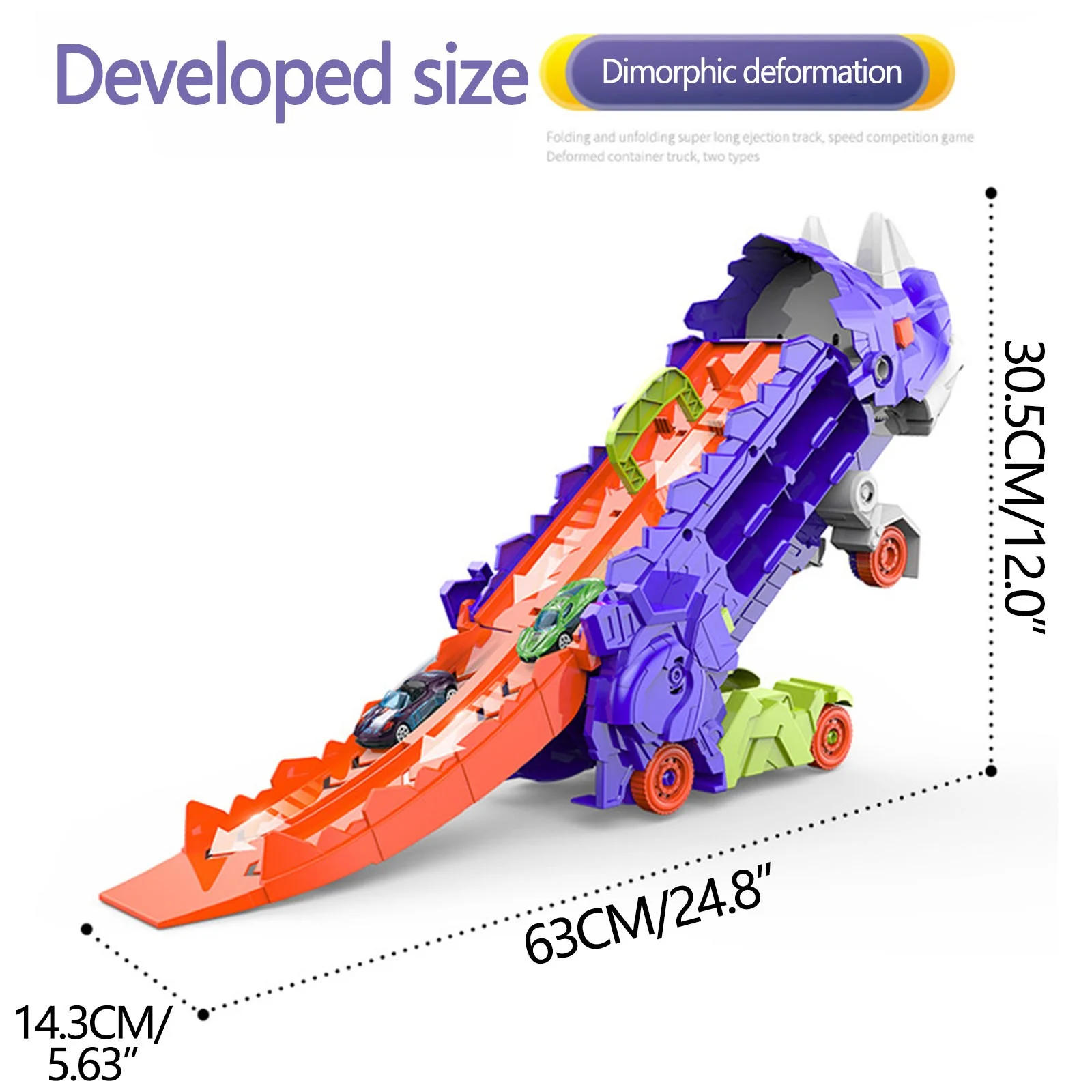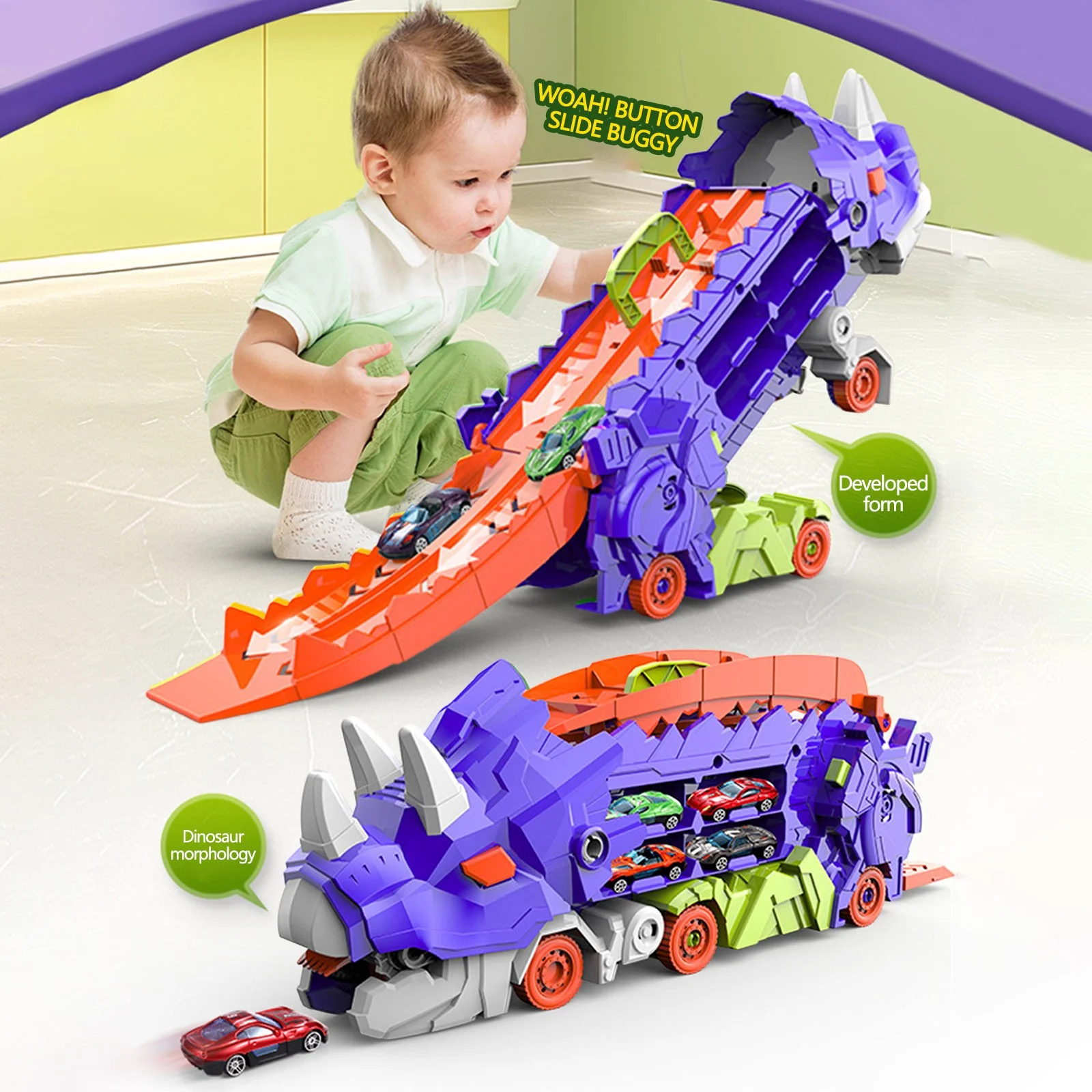 - Racing Track Action: Set up the thrilling stand-up dinosaur racing track for dual car races, allowing kids to participate in exhilarating competitions and experience the excitement of racing.
