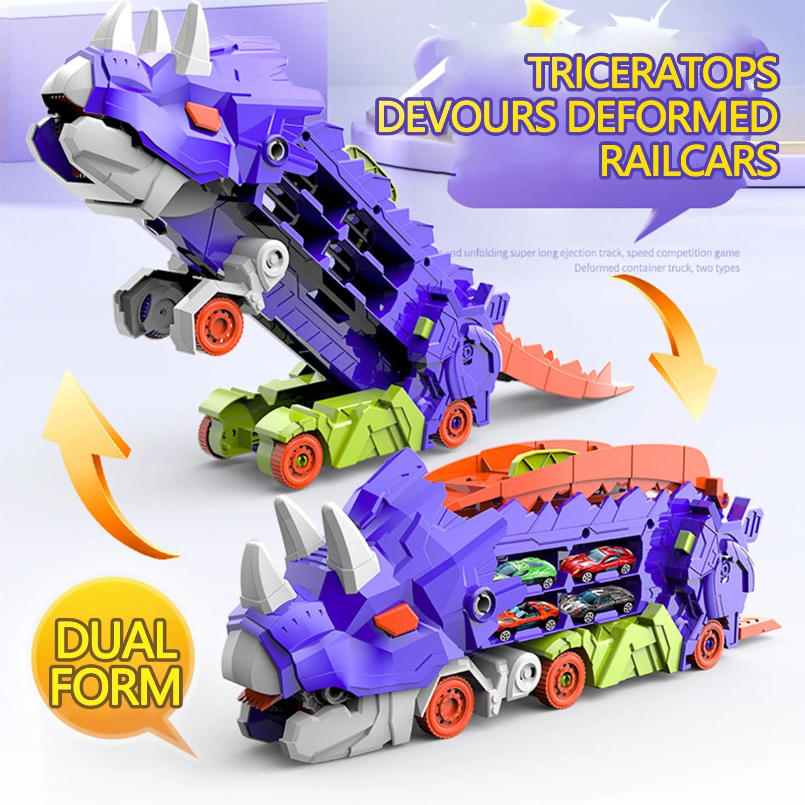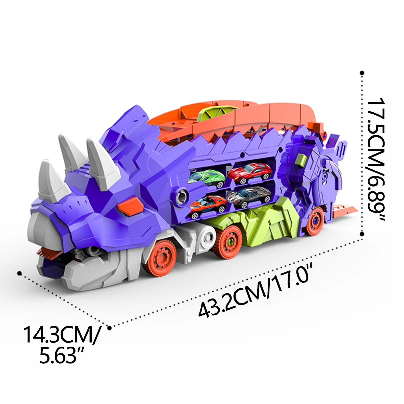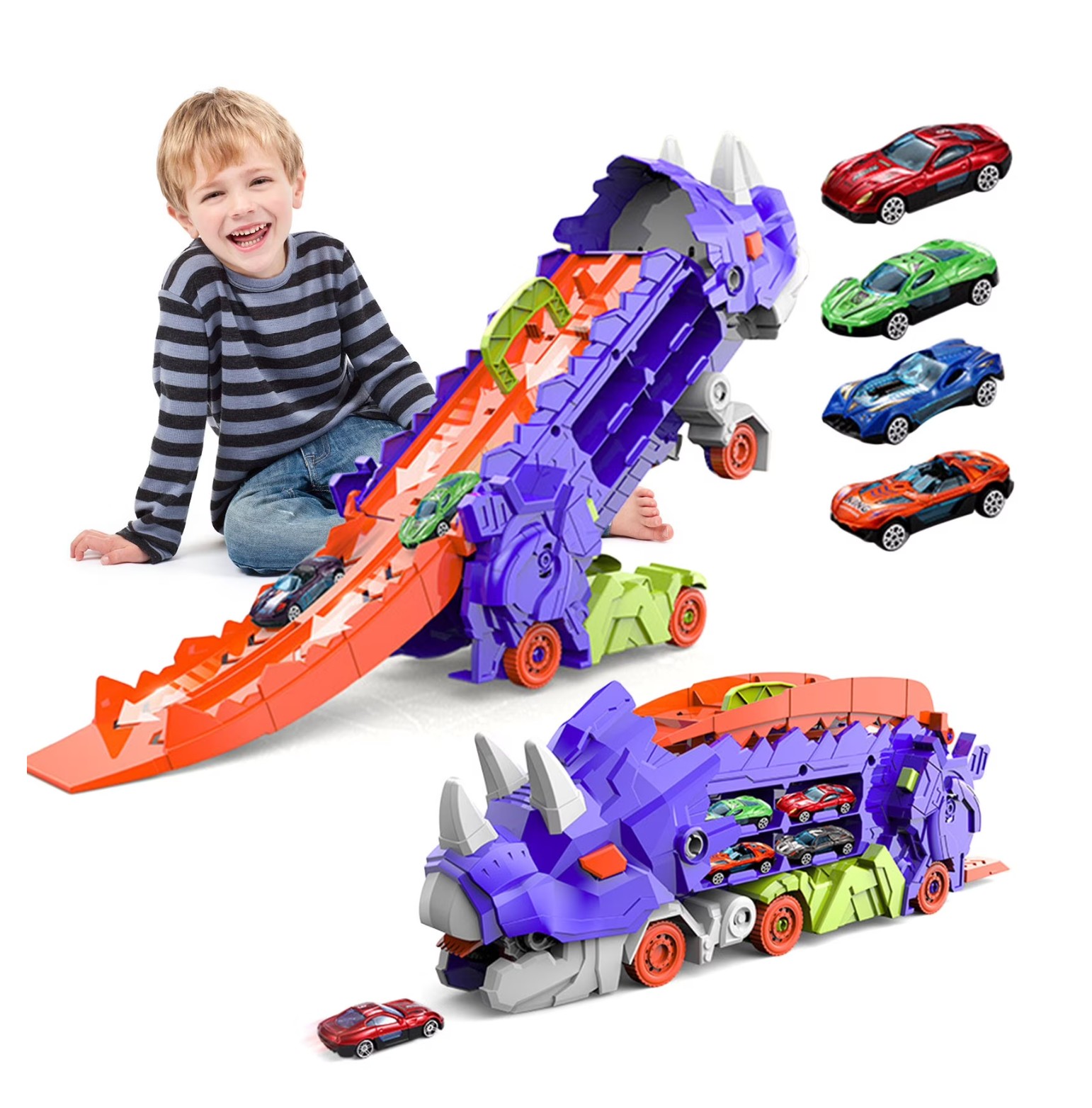 Dinosaur Hauler Transforming Truck – Double Transformation, Swallows 4 Cars, Includes Racing Track & Storage & 12 Metal Cars – Item #8209