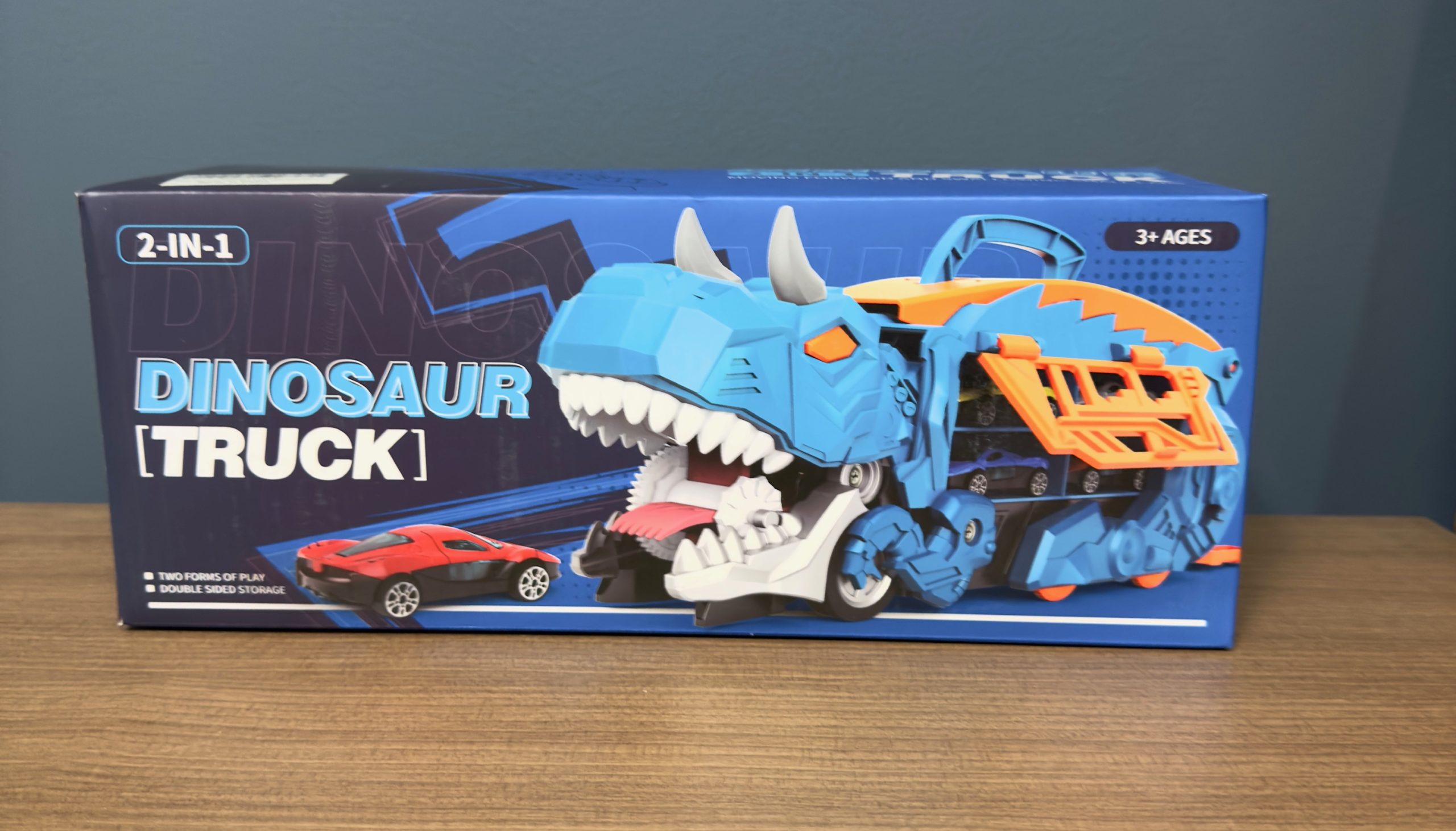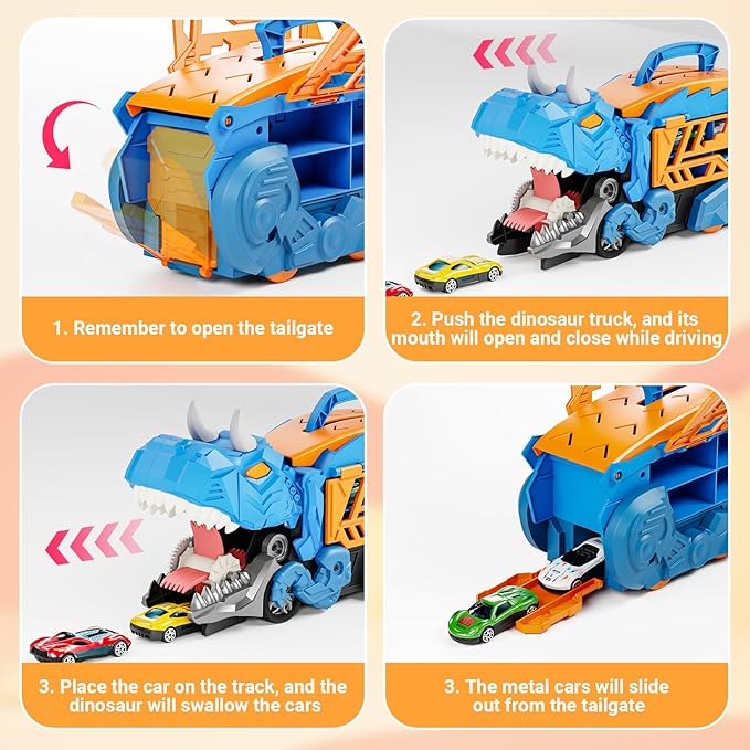 - 3-IN-1 DINOSAUR TRANSPORT TRUCK TOY: The Dinosaur Truck is made of high quality plastic, has a detailed and realistic look with a huge body, hidden handle and wings on both sides. The toy truck is great for kids to play push and pull games, can eat mini cars and transform into a cool standing dino, two tracks on the back for sliding races, and also serves as a storage space for the mini race cars.