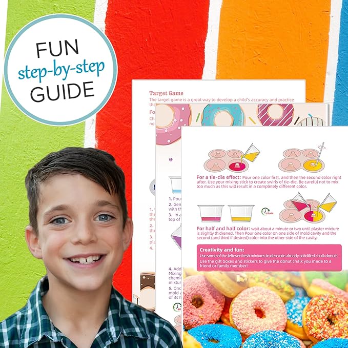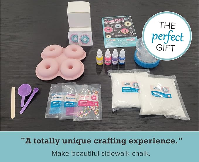 - TOTALLY UNIQUE CRAFT: You’ve never seen a craft kit like this. Make your own donut-shaped sidewalk chalk with our complete and colorful kit. Package makes 8 chalks.