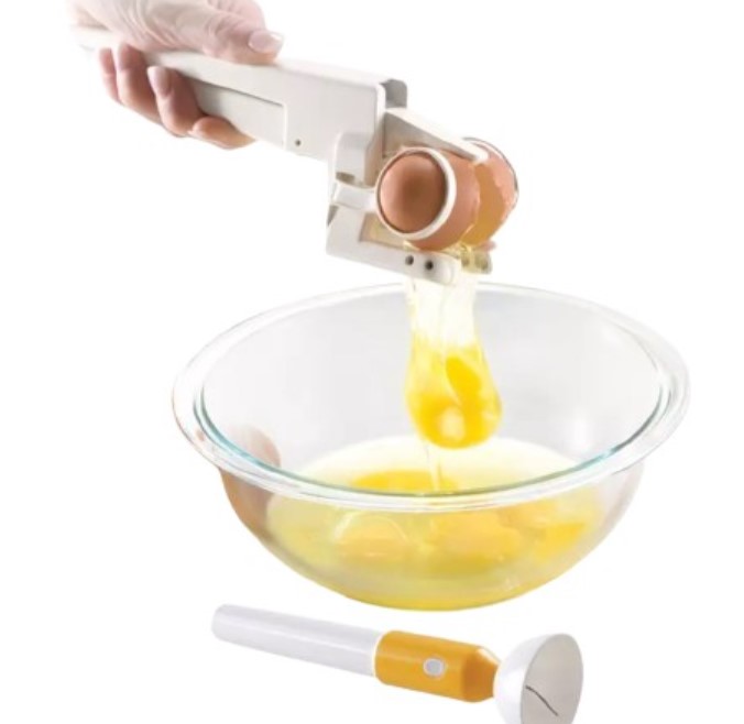 This gadget allows you to easily crack eggs with no mess! Clever Scrambler scrambles eggs inside of shell with no mess. Just place the egg onto the Clever Scambler and the eggs scramble inside of the shell. Scrambles your egg with a touch of a button. No more mess or shells in your food. Also comes with a bonus detachable yolk catcher to remove the yolk from the egg. Great device to use while baking, making omelets and much more!