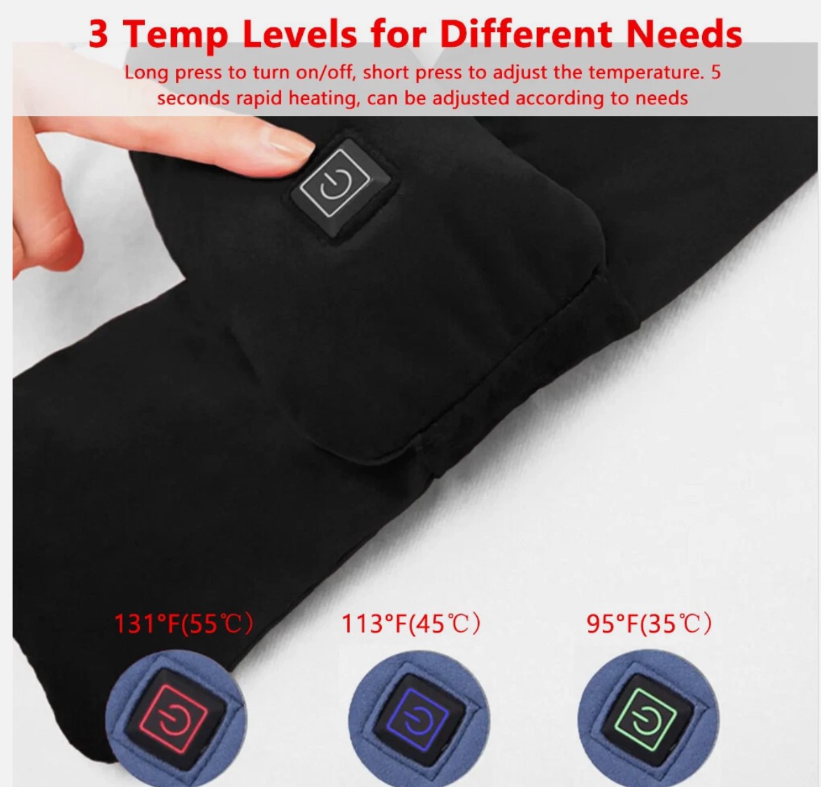 – Three-level temperature control adjustment: The heated scarf has three levels, which can cope with different weathers, GREEN-LOW TEMP about 35℃ (95°F), BLUE-MEDIUM TEMP about 45℃ (113°F) , RED-HIGH TEMP about 55℃(131°F)