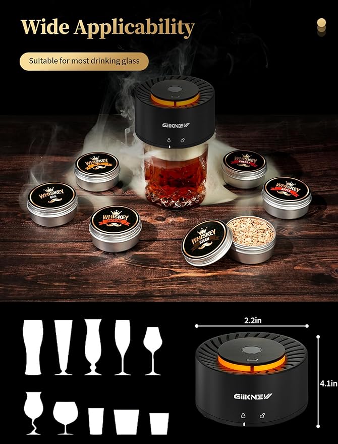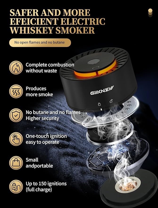 - Flame-Free Electric Innovation: Unlike traditional methods, our electric whiskey smoker kit offers a safer, cleaner, and more efficient way to infuse smoky flavors—no open flames or butane needed. Just recharge via USB (up to 150 uses per charge) and enjoy rich, smoky whiskey with the push of a button.
