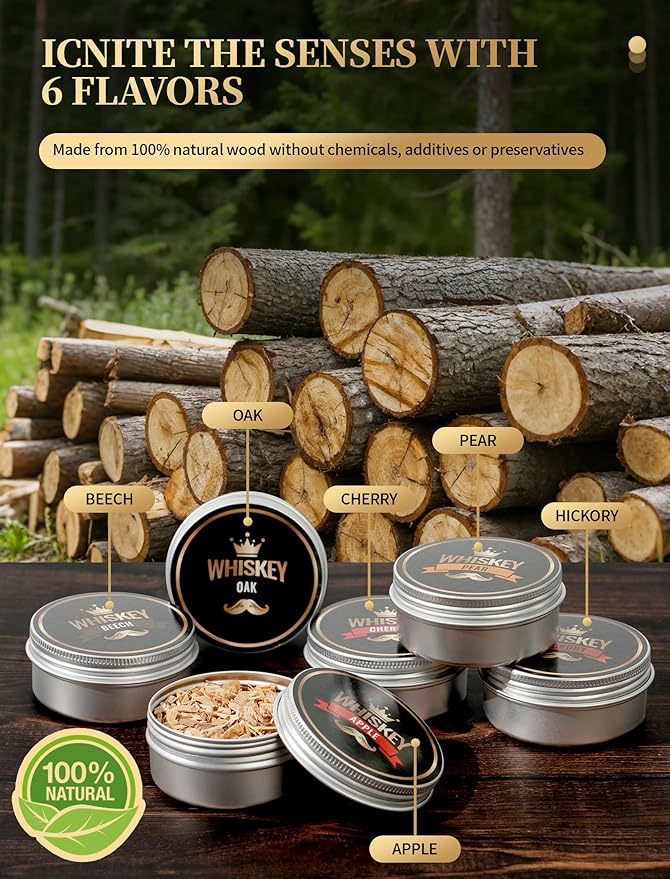 - 6 Premium Smoking Flavors: Customize your drinks with apple, cherry, oak, beech, pear, and hickory wood chips—each adding unique sweet, fruity, or woody notes. Our cold-smoke technology deepens flavor without heating, turning every sip into a luxury experience. Perfect for any drink smoker enthusiast.
