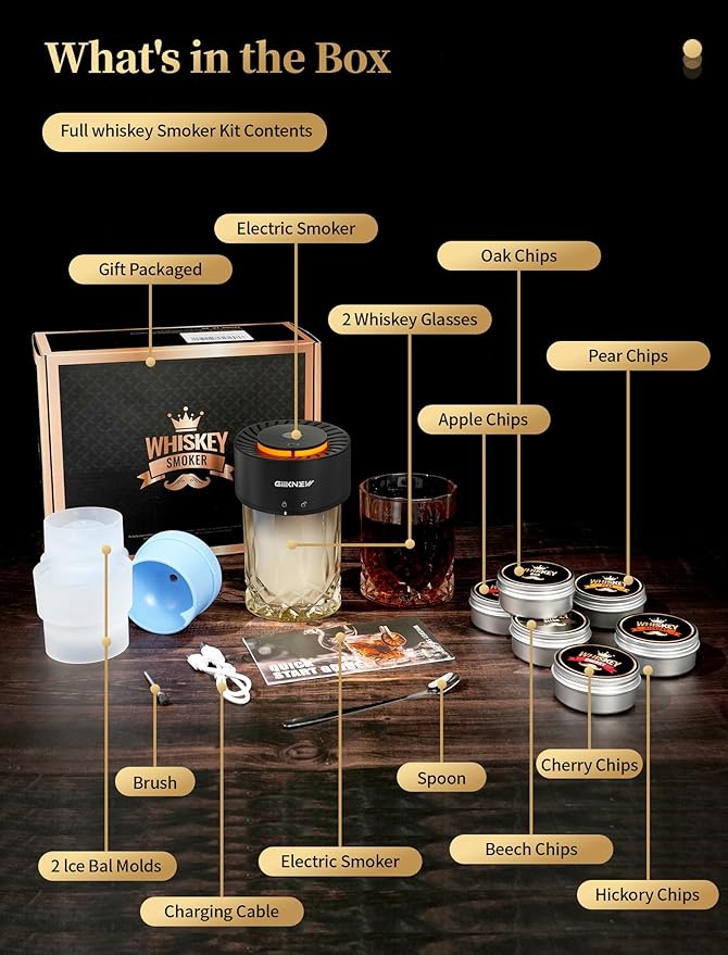 - Everything Included: The premium electric bourbon smoker kit includes Big Ice Ball Molds *2, Cleaning Brush & Spoon & USB Charger *1, Crystal Whiskey Glasses *2, Electric Whiskey Smoker *1, Wood Chip Flavors *6. Everything needed for a perfect smoke experience, it’s a thoughtful, impressive gift for family and friends.