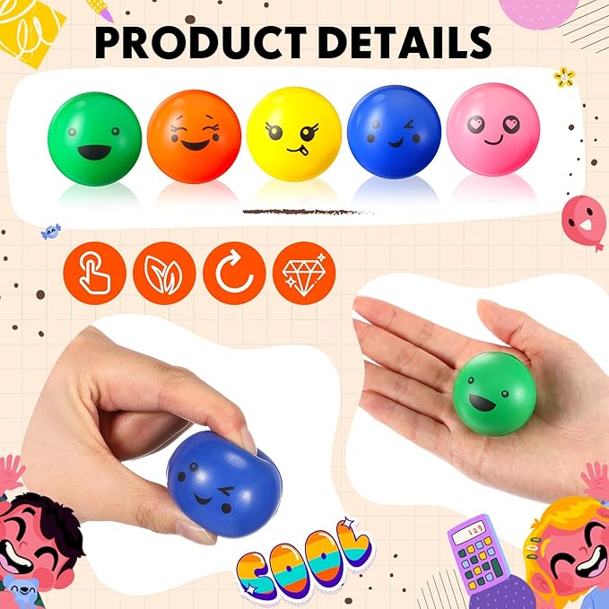 - This funny mini stress ball package includes a generous 360 round squeeze balls with various expressions in 5 colors and 5 styles; Suitable for relieving stress or packing in Christmas party favors, these stress balls offer laughter for kids, fulfilling the demand for stress relieving tools with a touch of humor