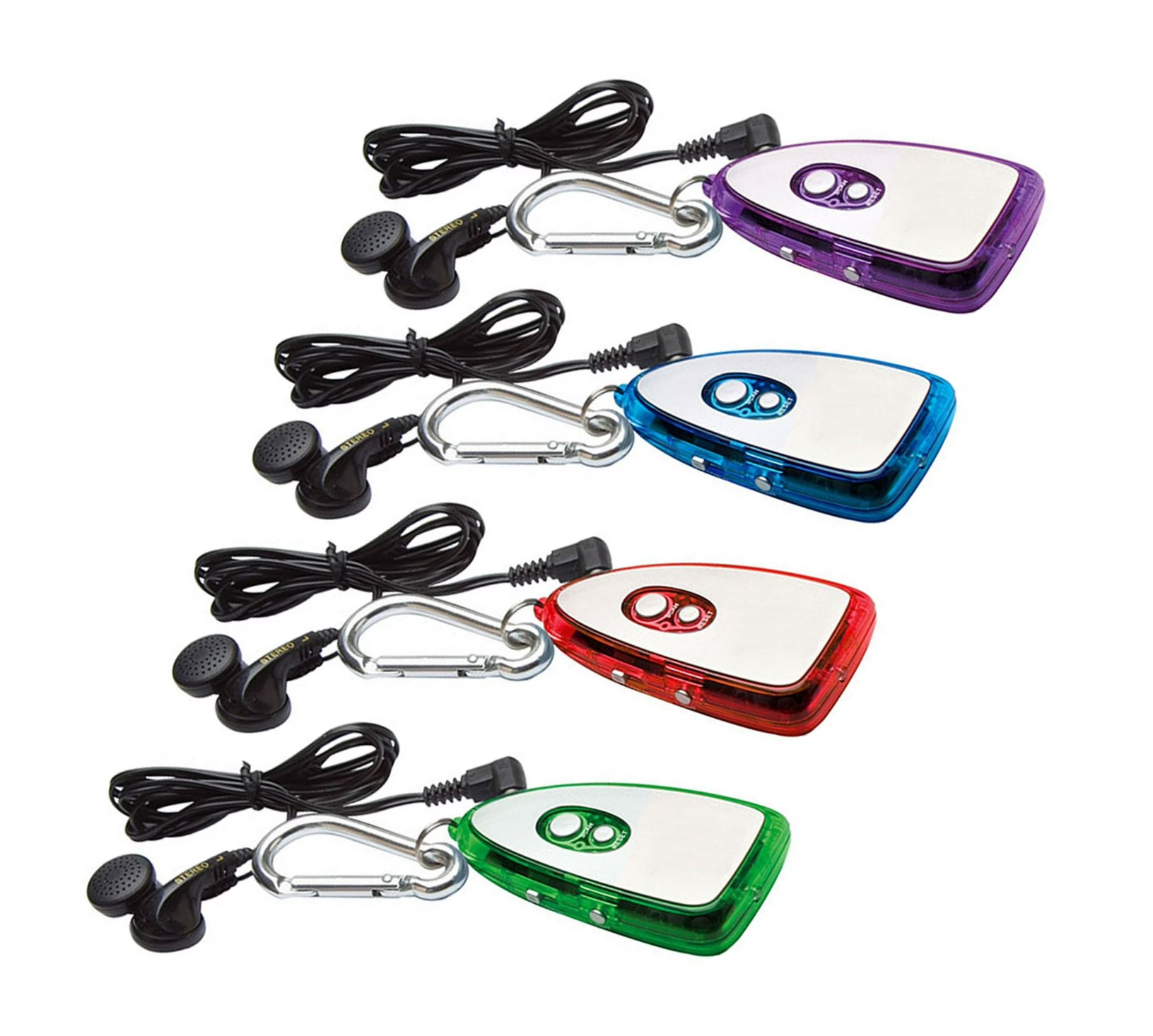 Measuring 3″ x 1 1/2″ x 3/8″, this convenient product comes with stereo earbuds and a built-in flashlight attached to a metal carabiner, so it’s easy to clip to your bag or belt loop.