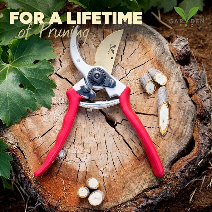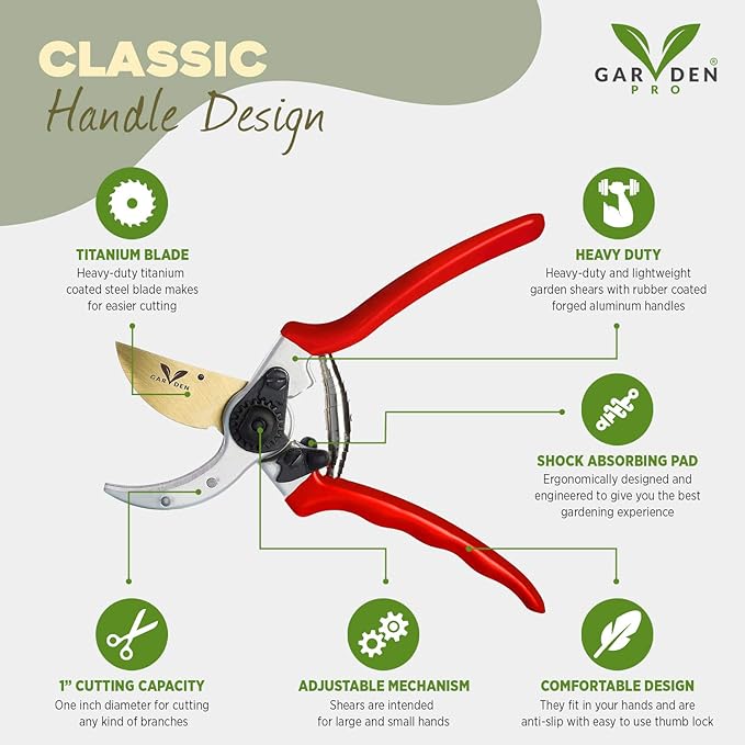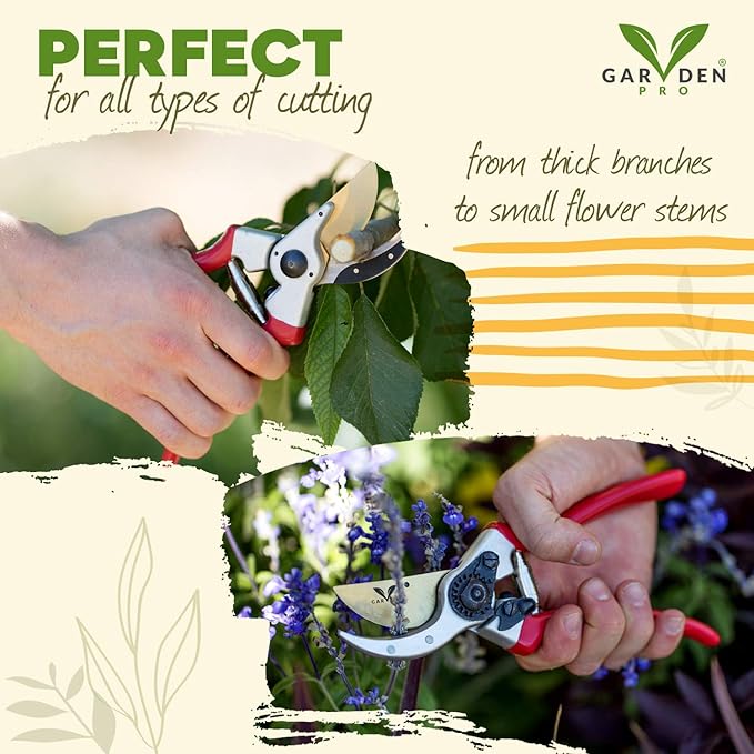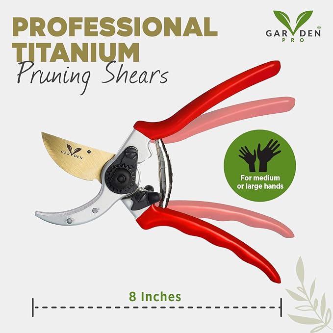 - PROFESSIONAL PREMIUM TITANIUM PRUNING SHEARS- Ergonomically designed and engineered to give you the best gardening experience. Our heavy-duty bypass garden shears combine lightweight forged aluminum handles and high quality strong titanium blades tha5t cut easily without tiring your hand. No pain! Easy to use also for those with arthritis and weak hands.