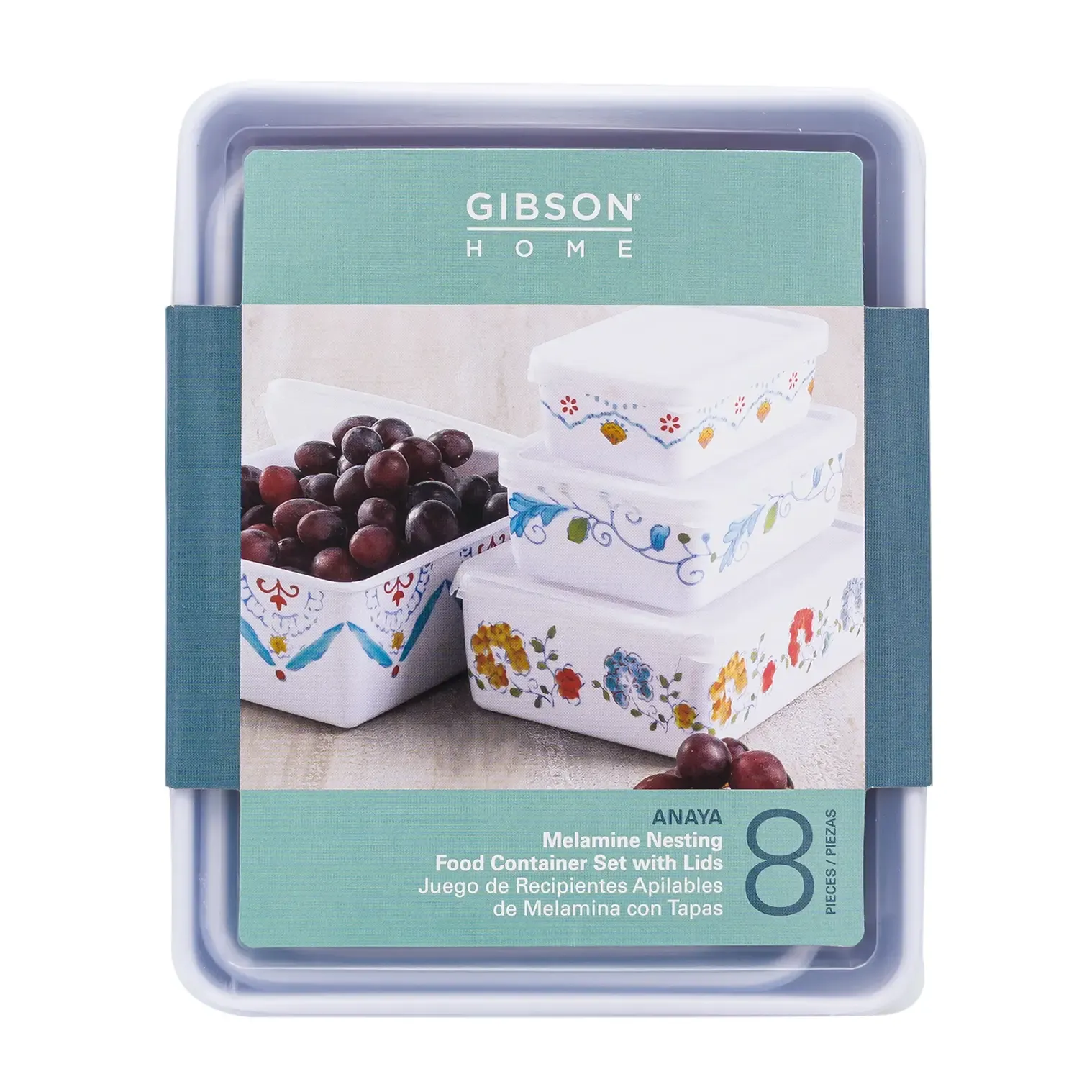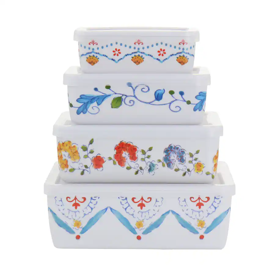 The Gibson Home 8 Piece Anaya Rectangular Nesting Food Storage Set comes with four reusable containers each with their own fresh seal lid. These rectangle shaped containers nest perfectly into each other for space saving storage when not in use. Each container has it’s own unique floral design around the rim and is constructed with lightweight and durable plastic. Varied sizes allow you to store fresh fruits and veggies, leftovers, lunches, snacks, and more!