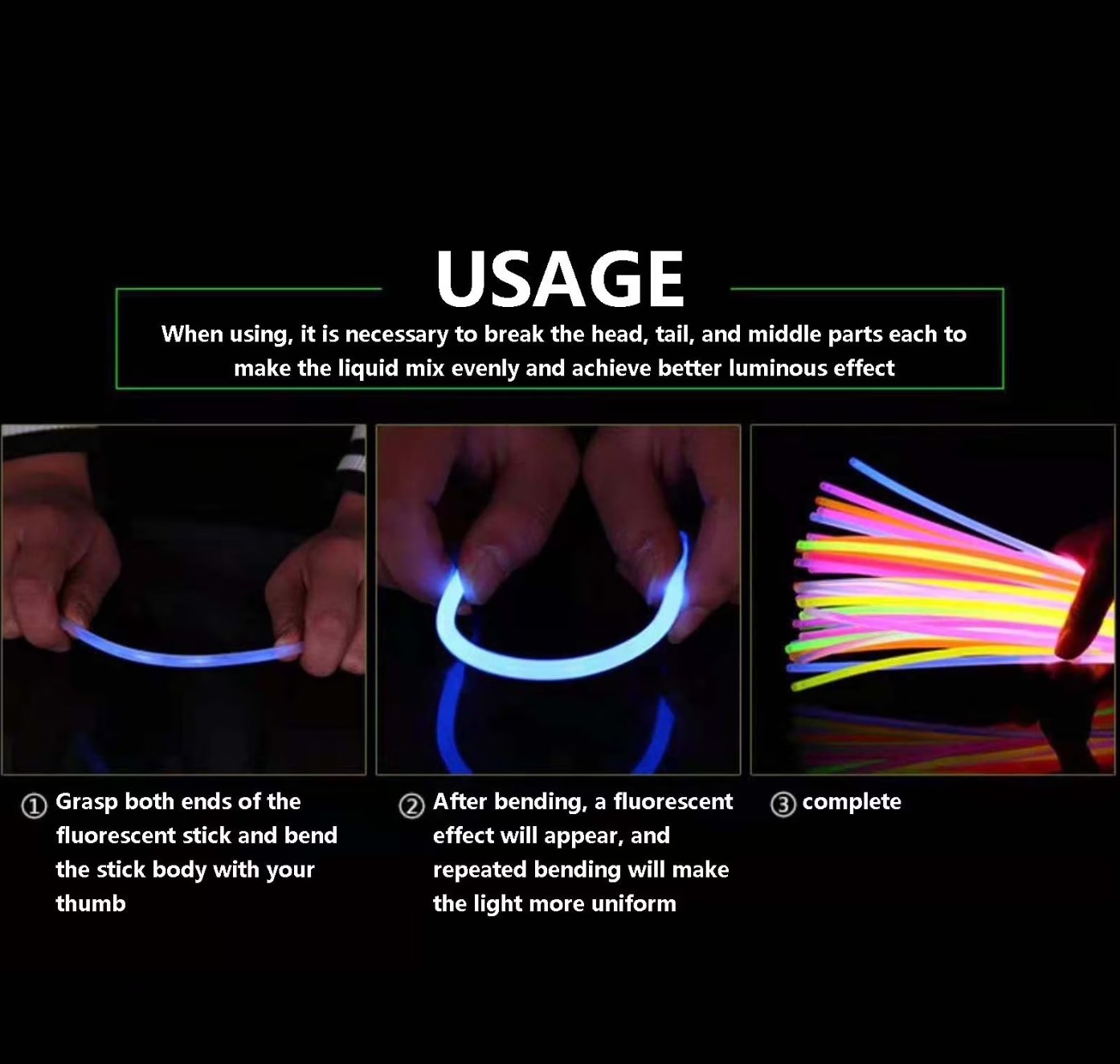 - REAL FUNCTION. Long-lasting and eye-catching. 3-6 hours of glow time. 7 colors: red, orange, yellow, green, blue, purple, and pink. Bend, snap, shake and you’re ready to go! Just enjoy your party all night without worrying they will fade away!