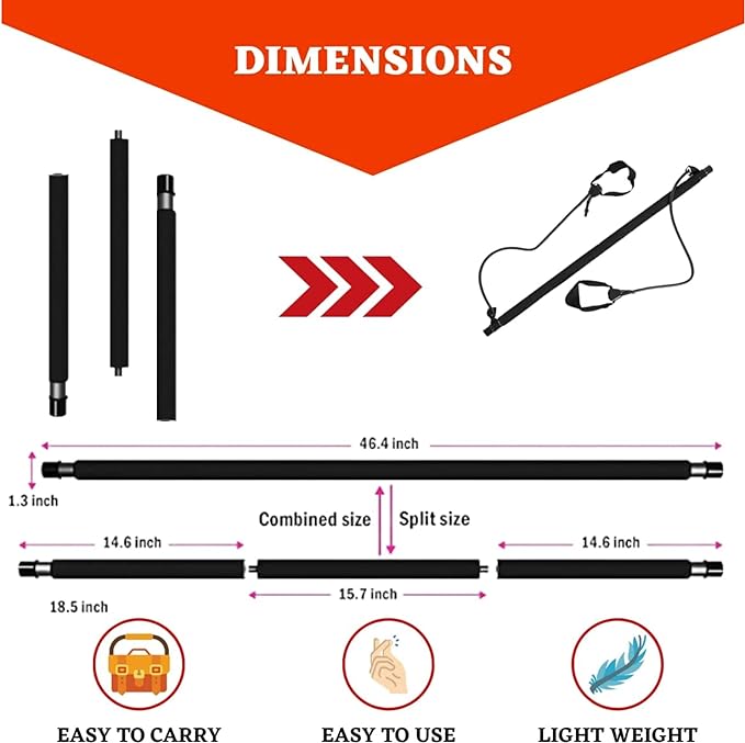 - Unique design: Portable pilates bar kit comprises of three detachable steel pipes that are perfectly balanced for smooth movements. The Pilates bar is lightweight, gives you a firm grip, and can be broken down so you can take this exercise bar with you anywhere.