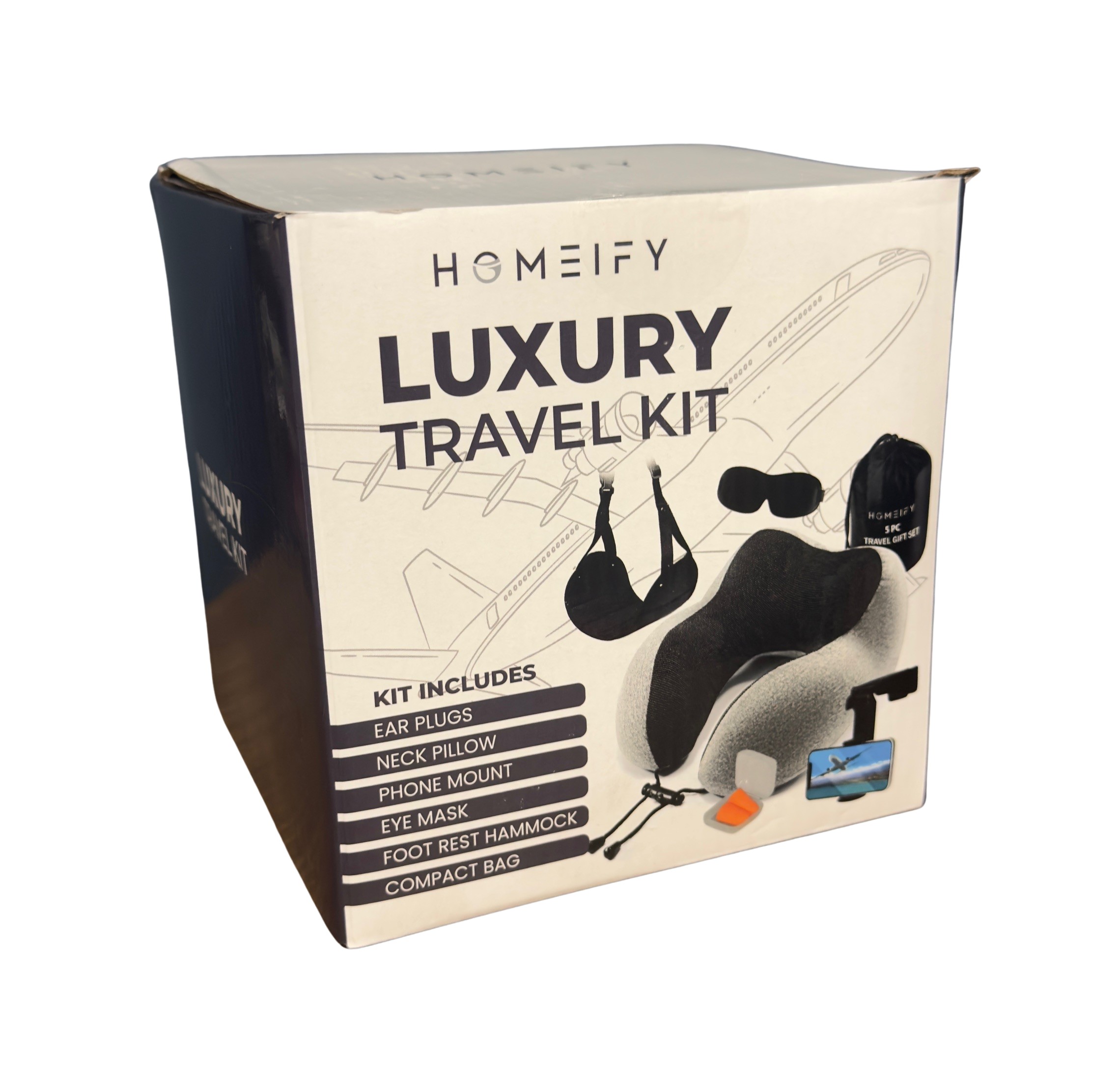 Homeify 6 Piece Plane Travel Essentials Kit – Memory Foam Neck Pillow, Phone Holder, Eye Mask, Foot Hammock and Earplugs – Item #8515