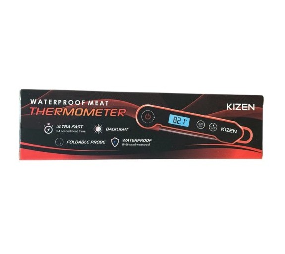 The Kizen Digital Waterproof Instant Read Meat Thermometer is a red-colored device designed for quick and accurate temperature readings. It features an IP66 waterproof rating, making it suitable for use in various cooking environments. With its instant read capability, this meat thermometer provides users with immediate temperature readings, ensuring that their food is cooked to perfection every time. Ideal for use in the kitchen, this thermometer is a practical tool for anyone looking to enhance their cooking skills.