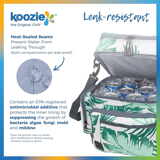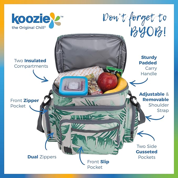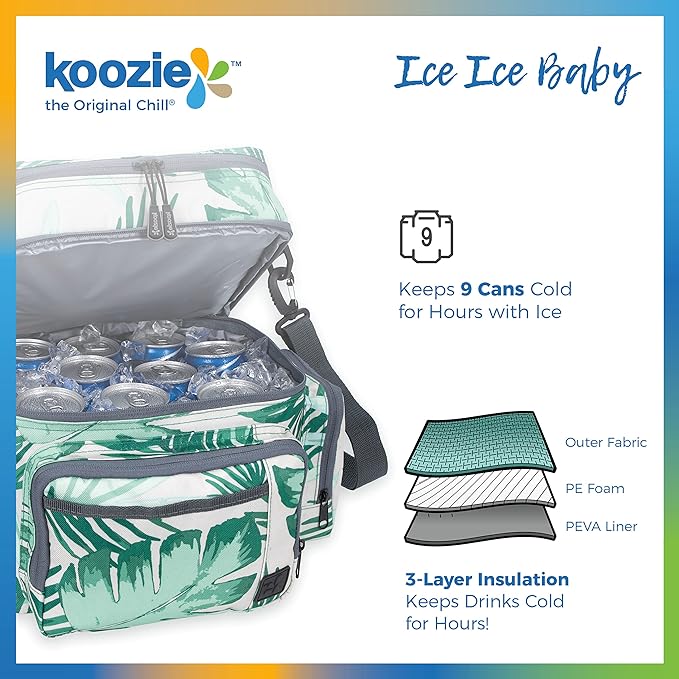 This premium Koozie insulated soft cooler bag is the perfect size to bring on your next adventure. When you need to keep your food and drinks hot or cold, take this small soft sided cooler along with you to the lake, beach, picnic or when fishing, hiking, boating or traveling. Also makes a great lunch box. Portable and easy to take anywhere using the padded should strap or the carry handle. Holds 9 cans or fill with your favorite snacks. Made with 42% post-consumer recycled PET equivalent to 8 plastic water bottles keeping plastic waste out of our oceans.